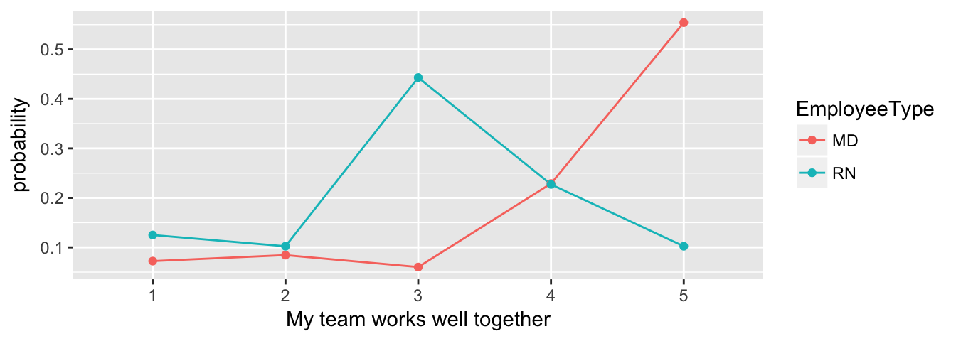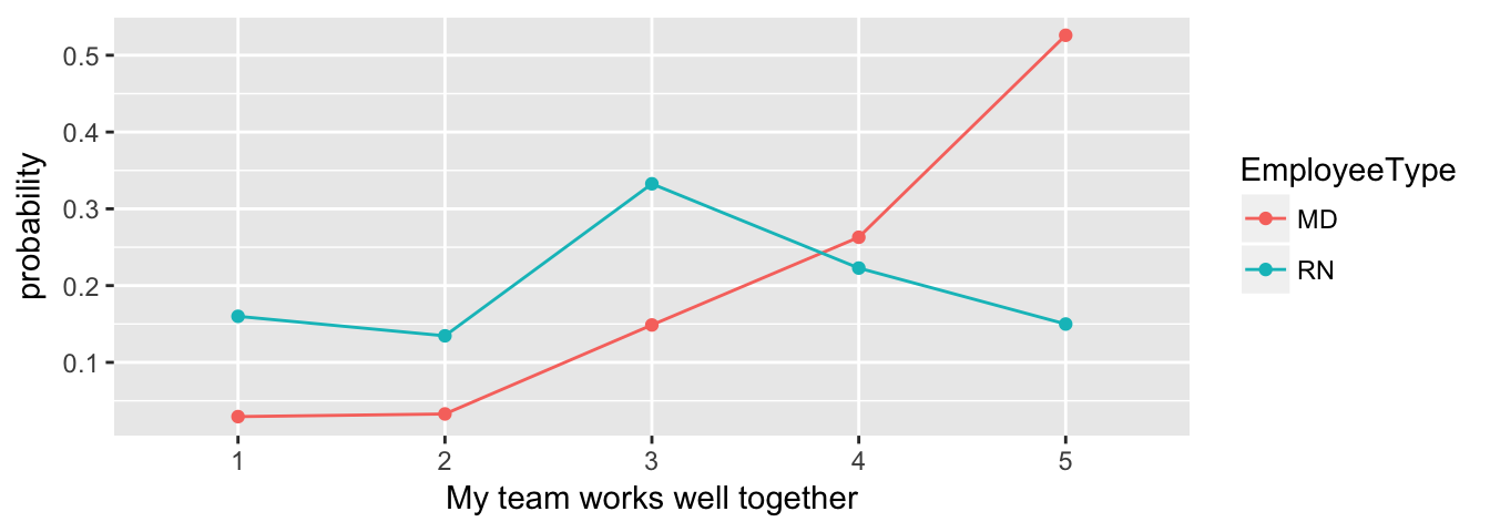 The multinomial regression model is a more powerful (and more modern) version of the \(\chi^2\) test. Here, we’re using an AIC-based information-theoretic approach to determine whether the data as we see it is as likely a model as a model that suggests no difference between MD and RN responses. The probabilities can be plotted with a line chart for easy comparison.