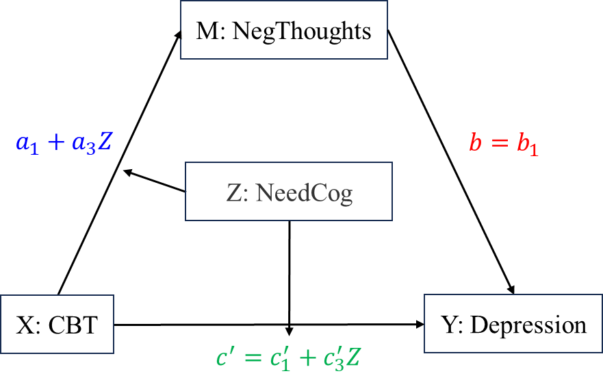 and \[\begin{align*} M&=a_0+a_1X+a_2Z+a_3XZ+\epsilon_M\\ Y&=c_0'+c_1'X+c_2'Z+c'_3XZ+b_1M+\epsilon_Y. \end{align*}\] By combining these two equations \[\begin{align*} Y&=c_0'+c_1'X+c_2'Z+c'_3XZ+\\ &\quad \enspace b_1(a_0+a_1X+a_2Z+a_3XZ+\epsilon_M)+\epsilon_Y\\ &=c_0'+c_2'Z+(c_1'+c_3'Z)X+\\ &\quad \enspace b_1(a_0+a_2Z)+b_1(a_1+a_3Z)X+b_1\epsilon_M+\epsilon_Y\\ &= c_0'+c_2'Z+(a_0+a_2Z)b_1+\\ &\quad \enspace [\green(c_1'+c_3'Z)+\blue(a_1+a_3Z)\red b_1\black]X+ \\ &\quad \enspace \grey b_1\epsilon_M+\epsilon_Y. \end{align*}\] In this first stage moderated mediation model, the mediation effect is \((a_1+a_3Z)b_1\); the moderation effects of two moderated paths are