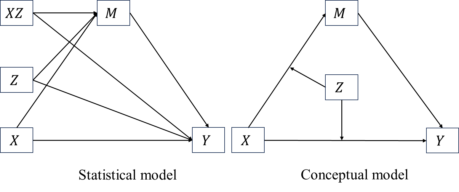 In moderated mediation, the relationship between \(X\) and \(Y\) without mediator \(M\) can be moderated by moderator \(Z\) \[\begin{align*} Y&=c_0+c_1X+c_2Z+c_3XZ+\epsilon_Y. \end{align*}\]