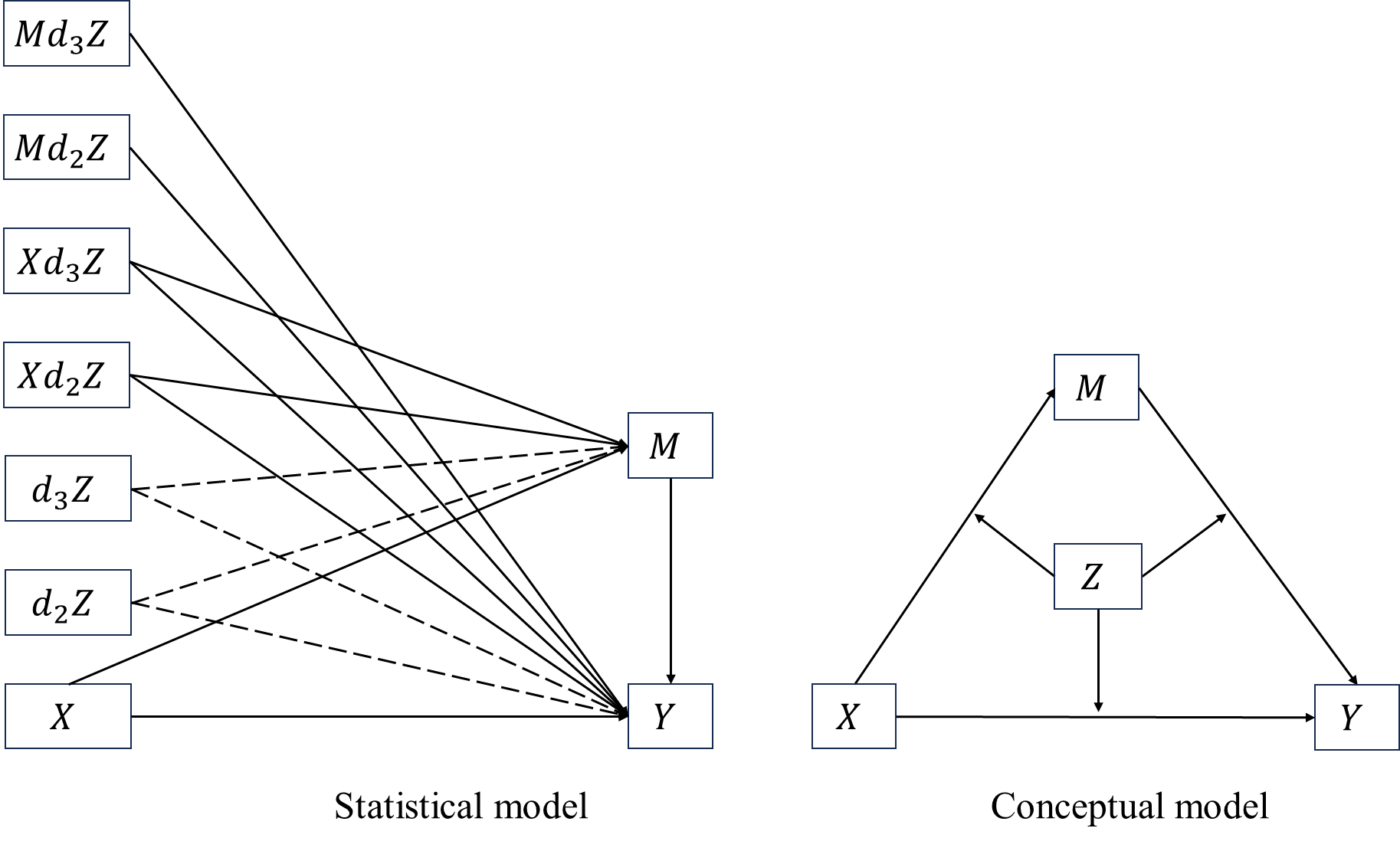 If we did not assume the path between \(X\) and \(Y\) is moderated by \(Z\), then we replace \(c_3'\) with 0 in above equations, the resulting conceptual model is