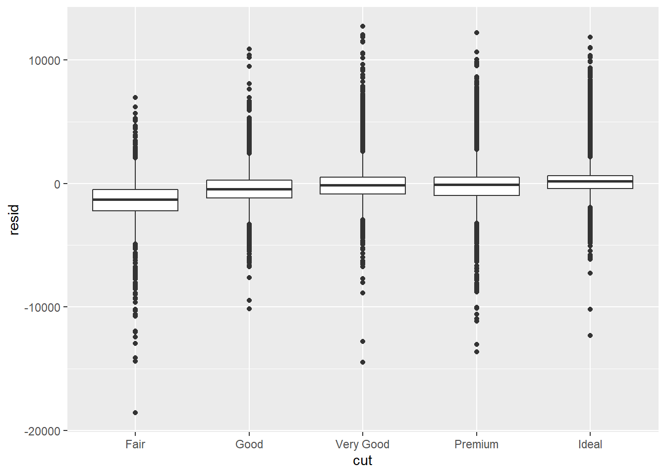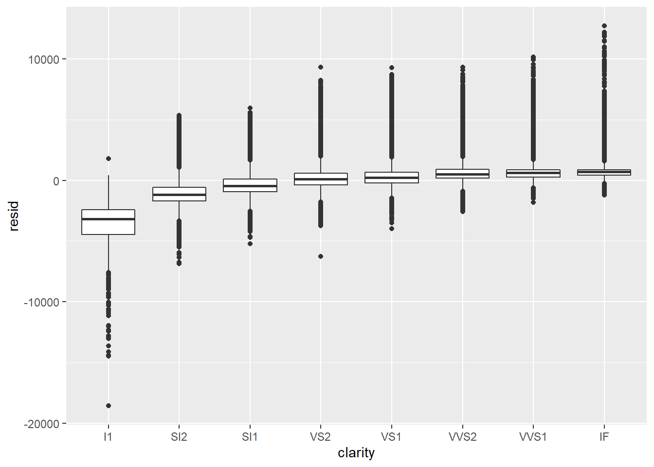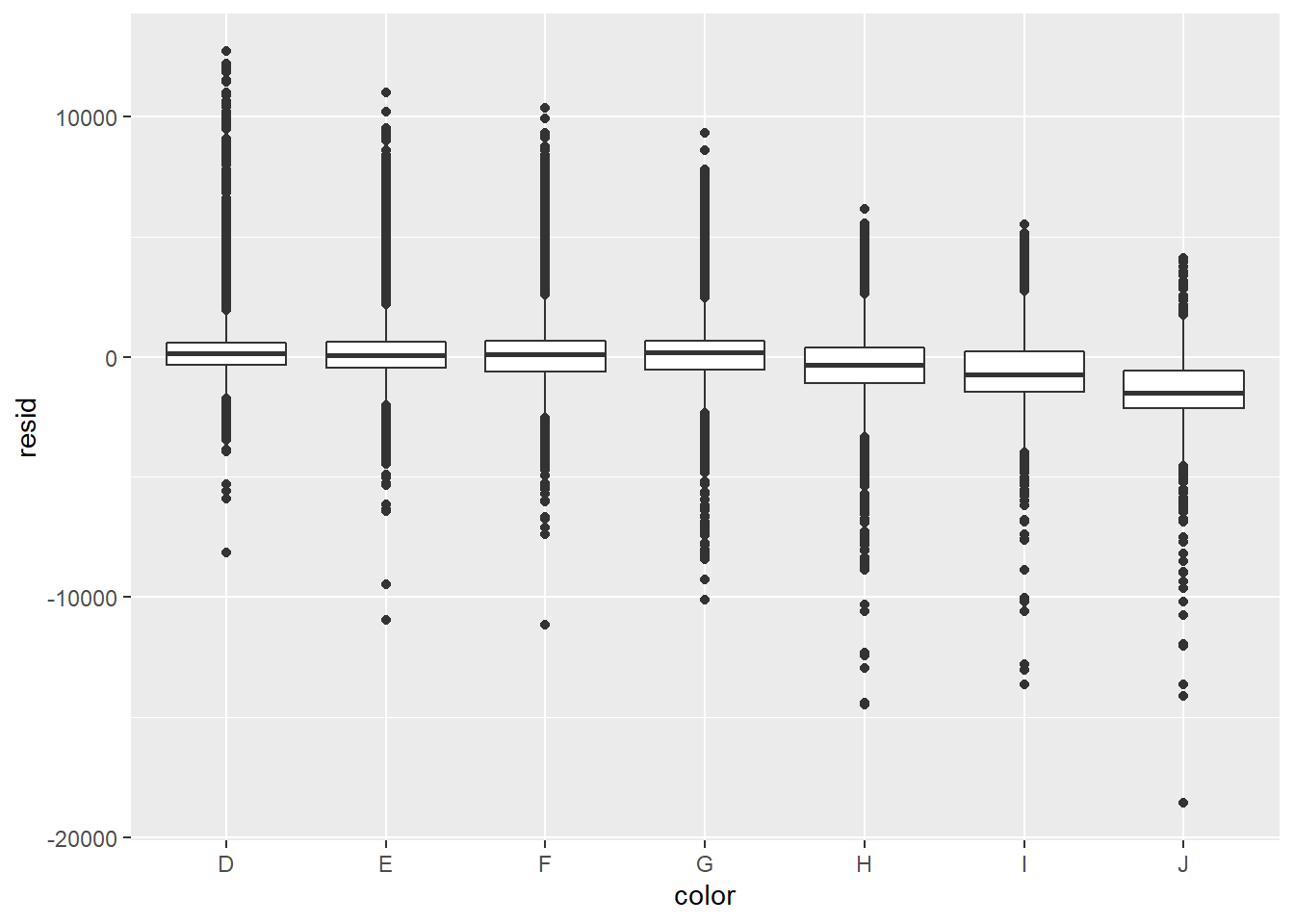 - Interpret what the three boxplots of diamond quality vs. residuals tell us.