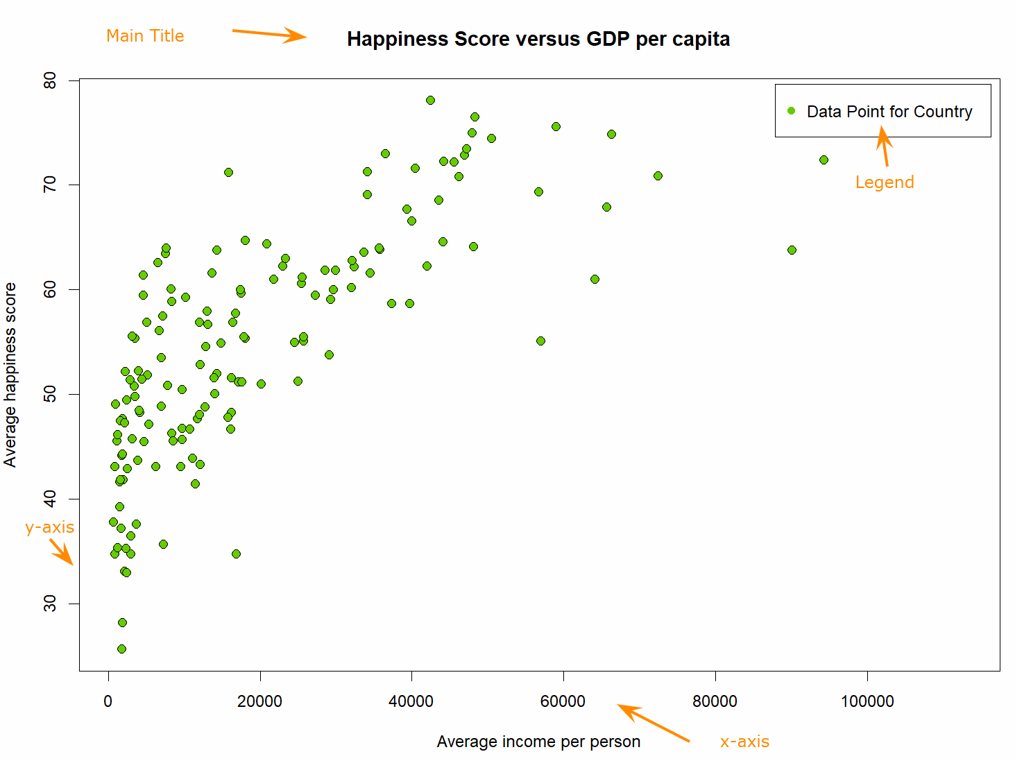 If we are using a graph to plot data for two continuous numeric variables (i.e. if we are creating a scatter plot), there are several features to which we typically refer. These are outlined below: