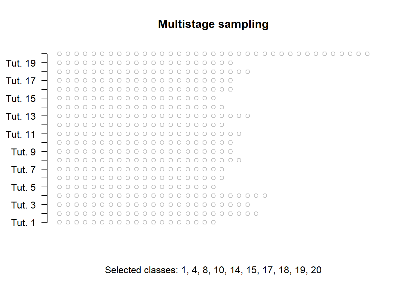 The animation below shows how a sample of approximately 40 students could be obtained using multistage sampling, by randomly selecting 10 classes at random in Stage 1, then randomly selecting students from each class in Stage 2.