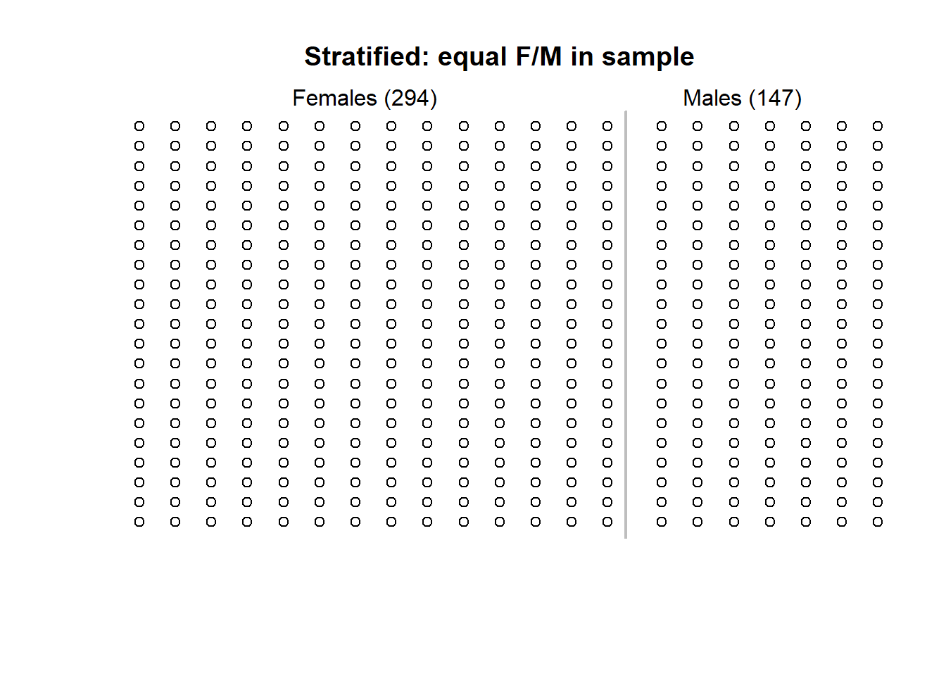 The animation below shows how a stratified random sample of size 40 might be selected, by randomly selecting 20 female and 20 male students.