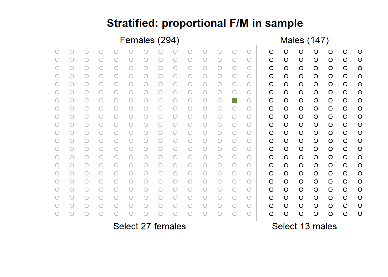 Similarly, the second animation below shows how a stratified random sample of size 40 might be selected, by randomly selecting 27 female and 13 male students.