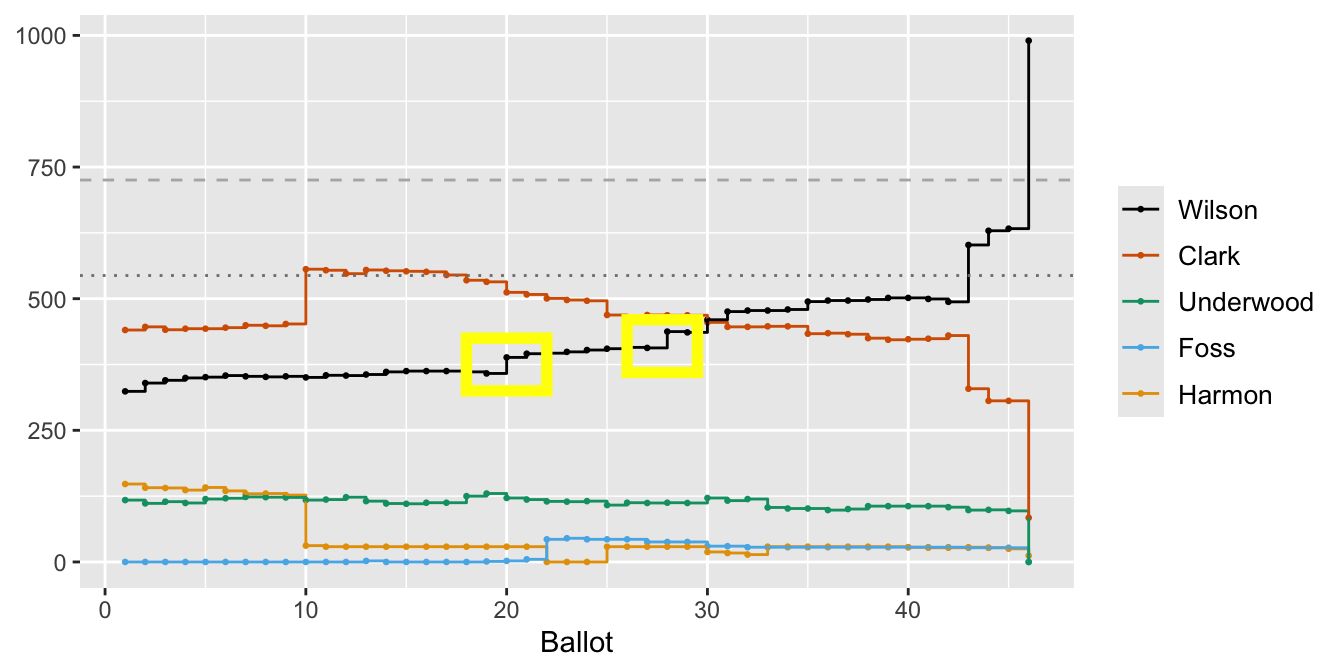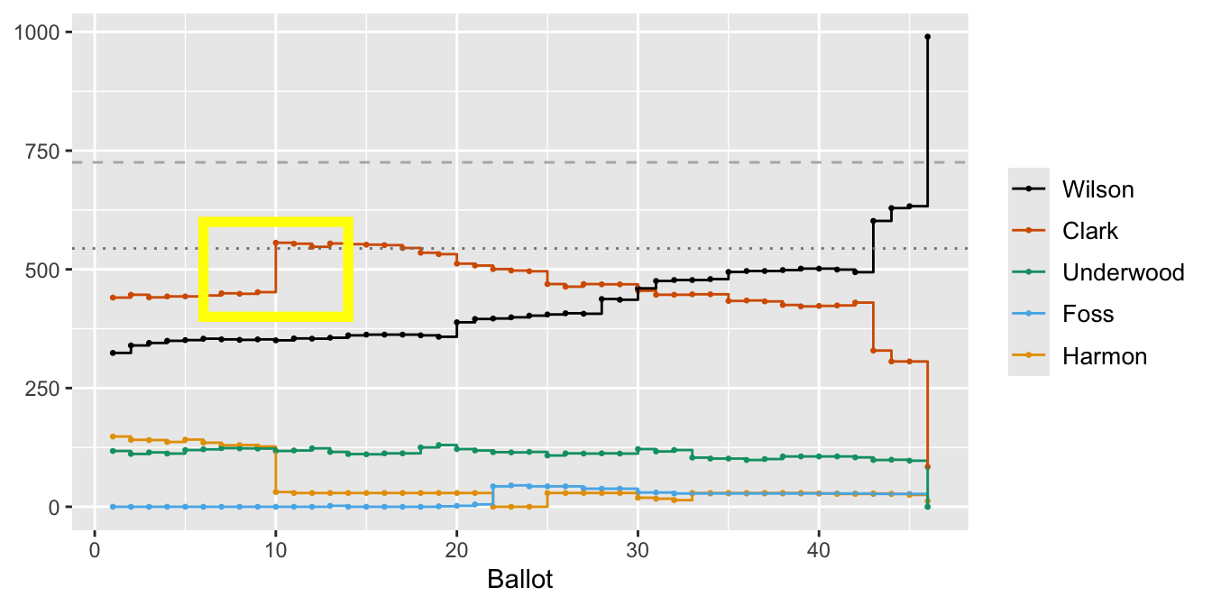 There is a good chapter on the 1912 Democratic convention in the first volume of Link’s biography of Woodrow Wilson (Link (1947)). The main source for the analysis here is the official report on the convention (Woodson (1912)) that includes all the counts in detail.