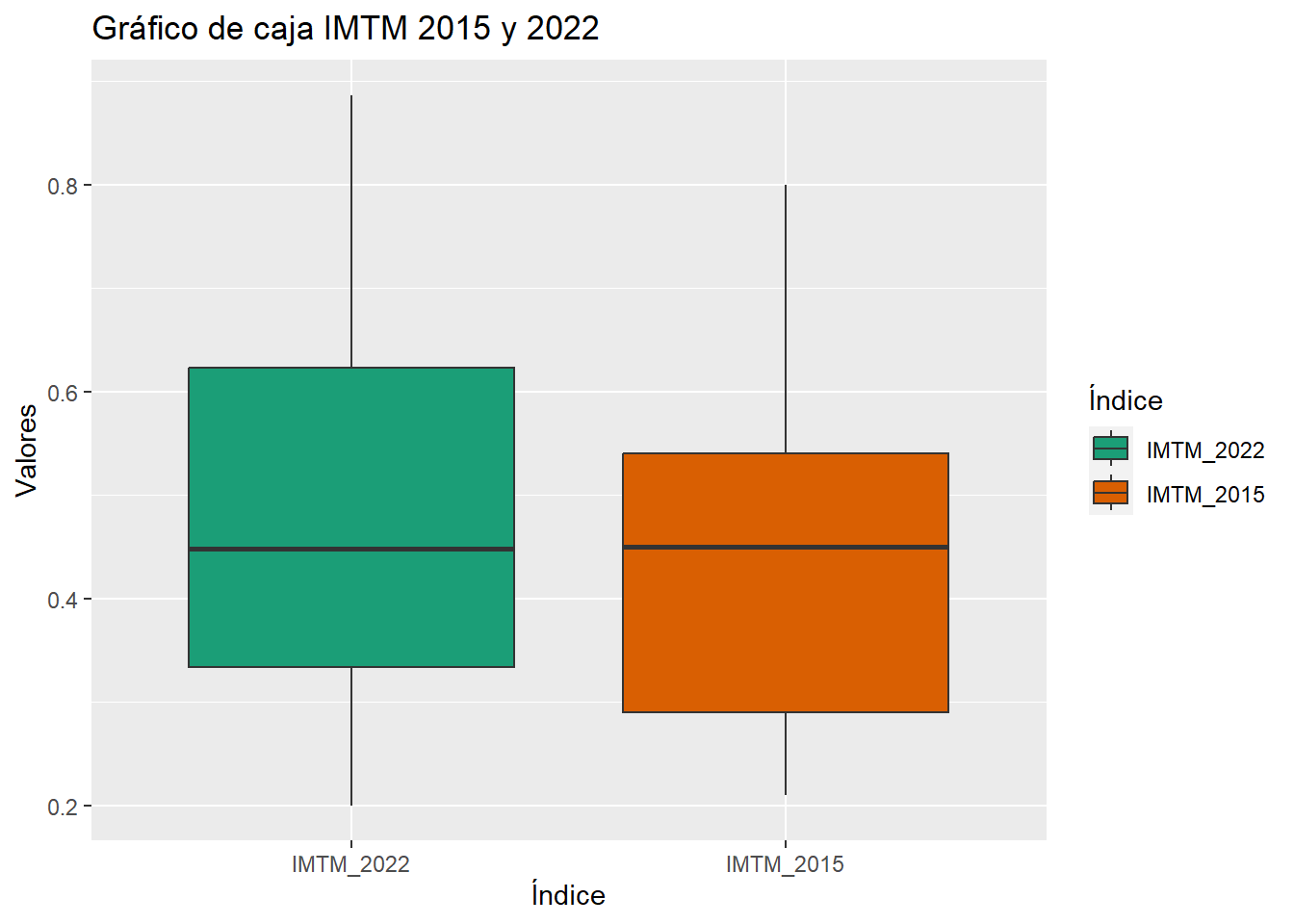 Para Contrastar el IMTM 2015 y el IMTM 2022 se realizará una tabla de datos que incluya la diferencia entre ambas variables. También estadística descriptiva y gráficos de caja.
