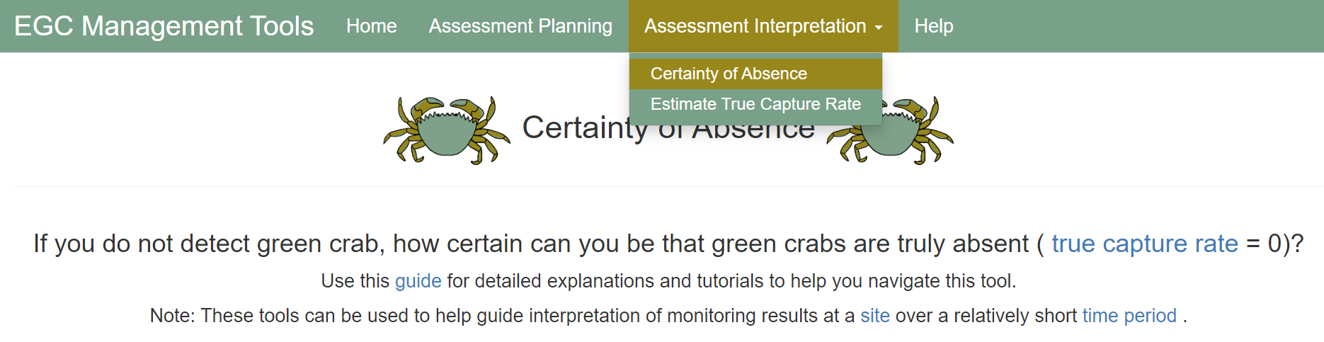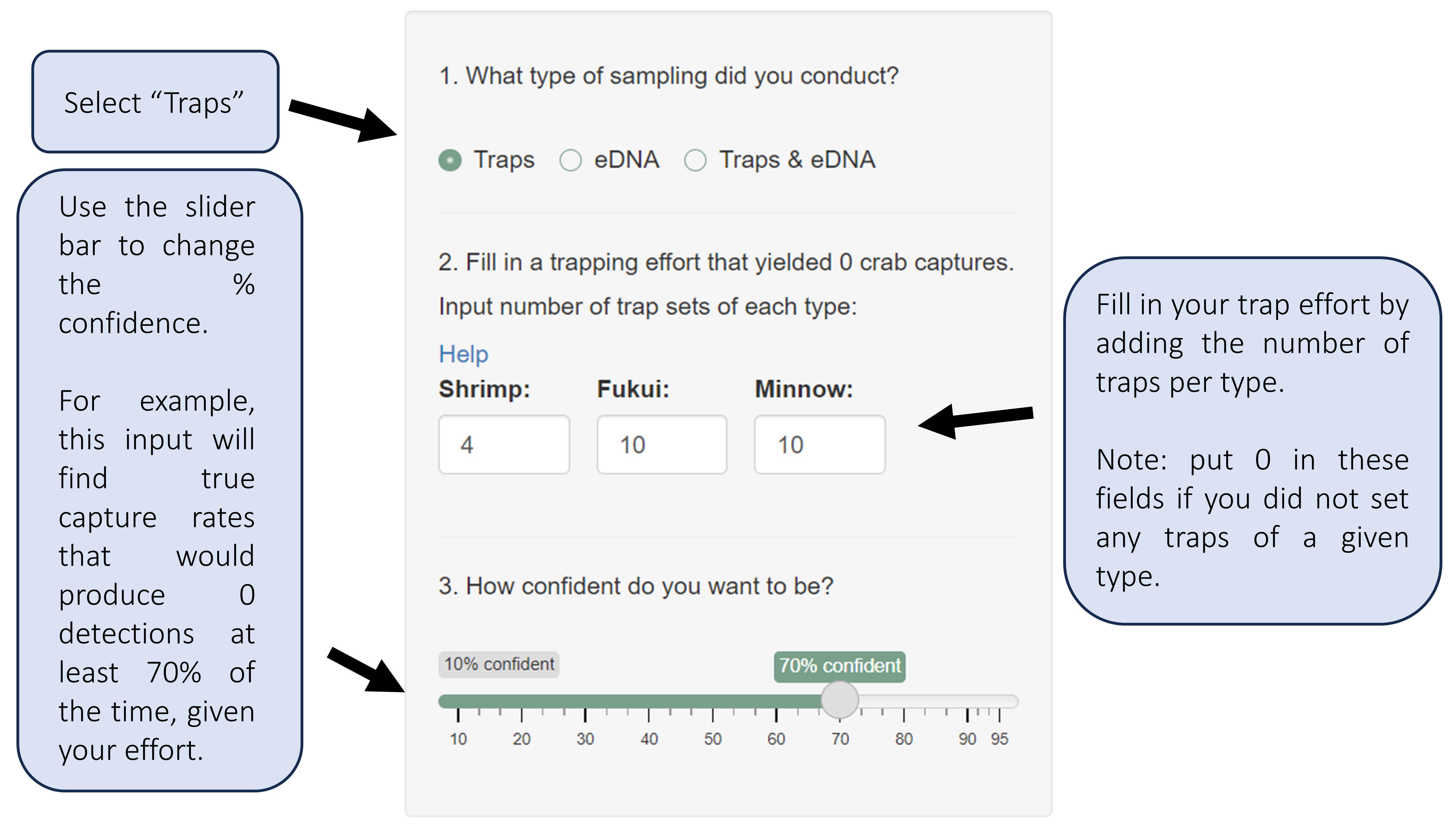 This tool is useful if you have already conducted a green crab monitoring assessment, did not detect green crab, and want to know how certain you can be that green crab are truly absent. More specifically, given your monitoring effort, this tool finds the true capture rates that would produce no detections.