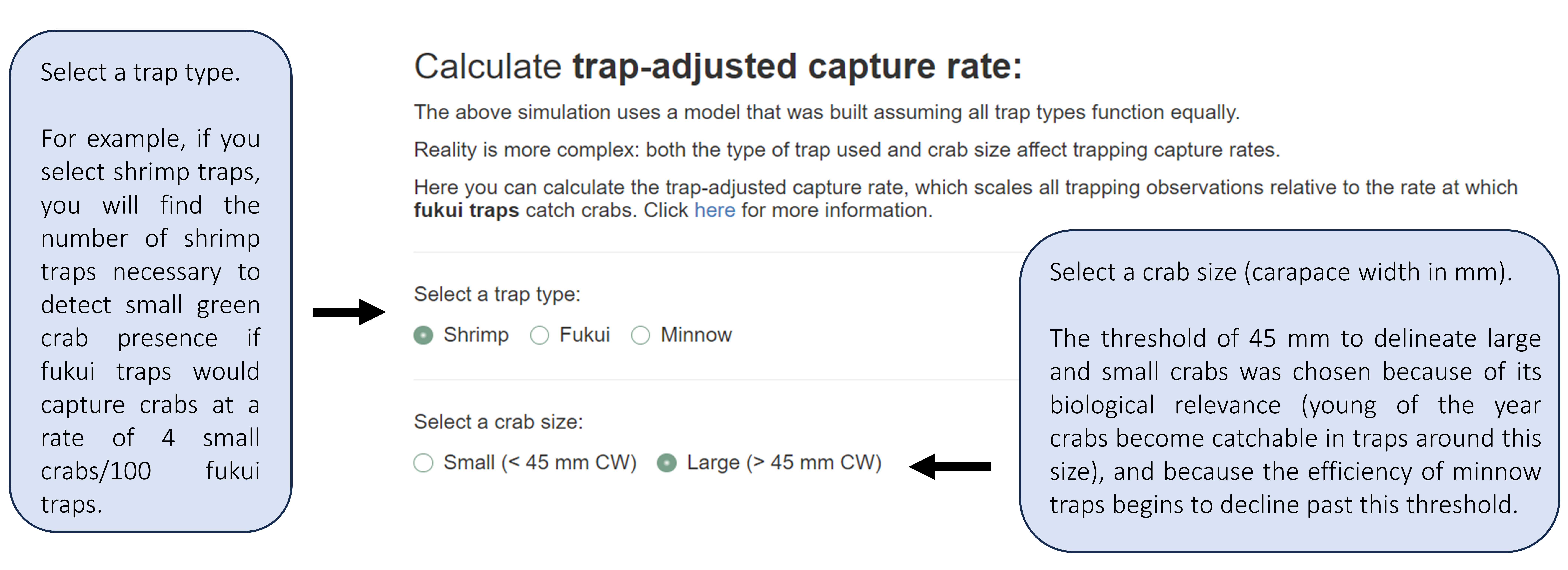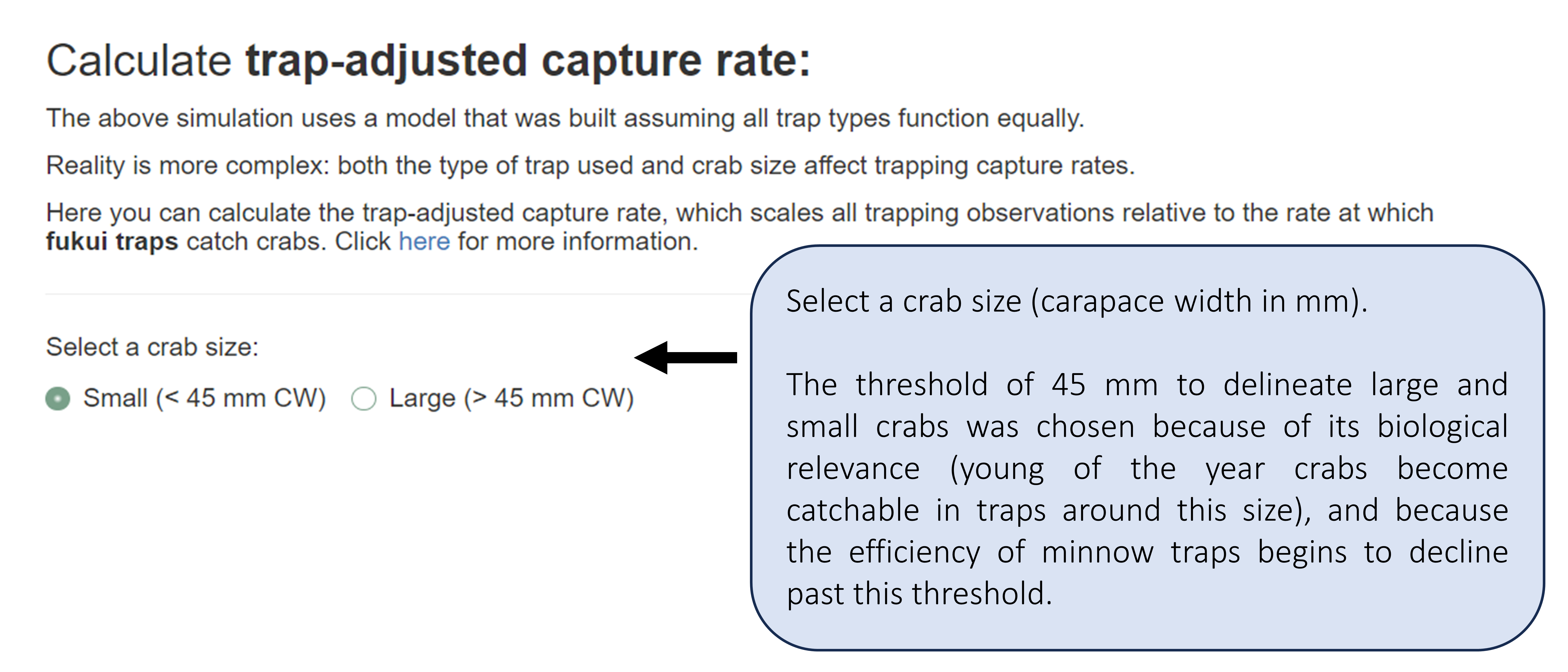 Although you inputted the number of traps of each type, the previous lowest detectable capture rate section assumed all trap types function equally. However, both the type of trap and crab size affect capture rates.