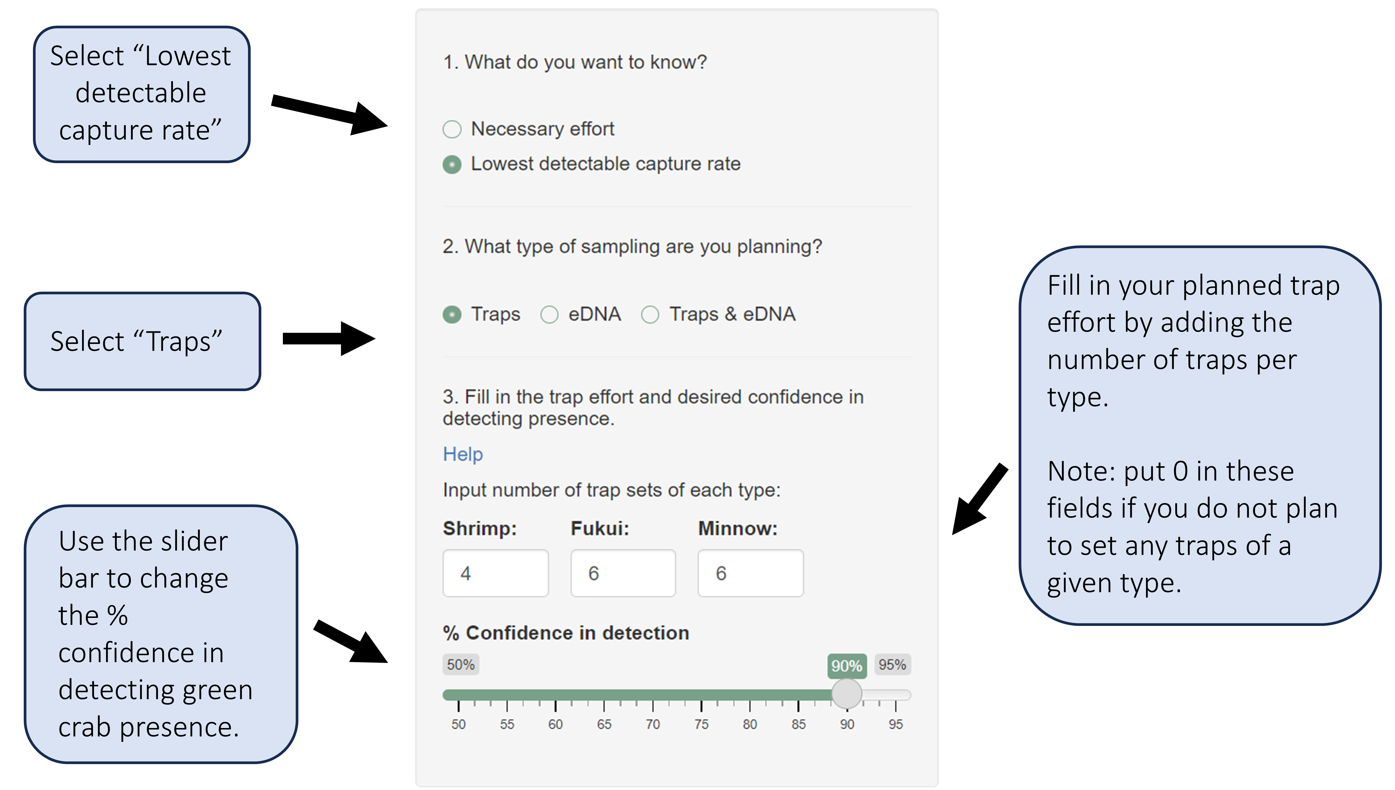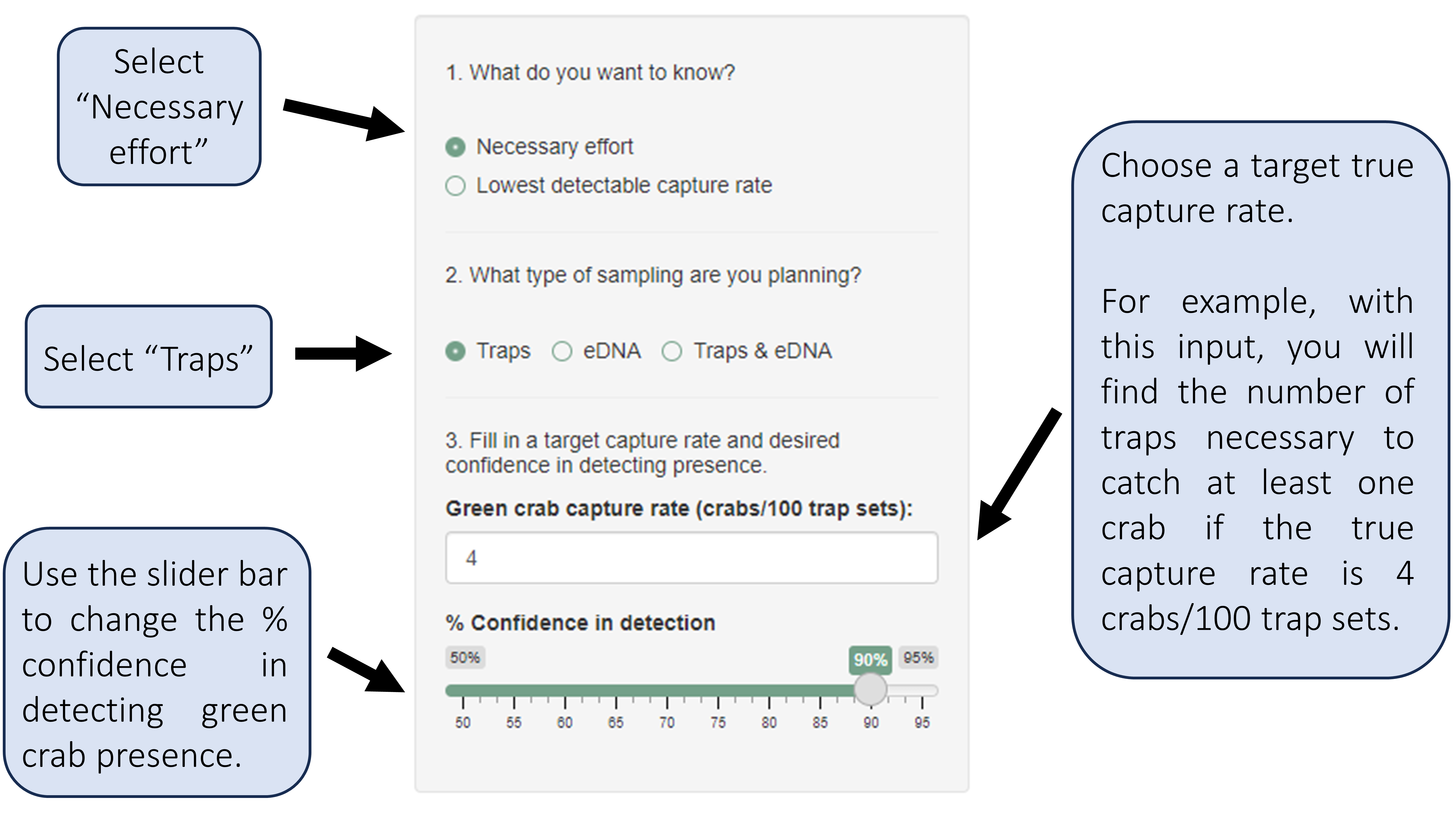 This function helps you identify the effort necessary to detect green crab presence. Navigate to Assessment Planning > Necessary effort. In these sections, we will focus on only trapping efforts.