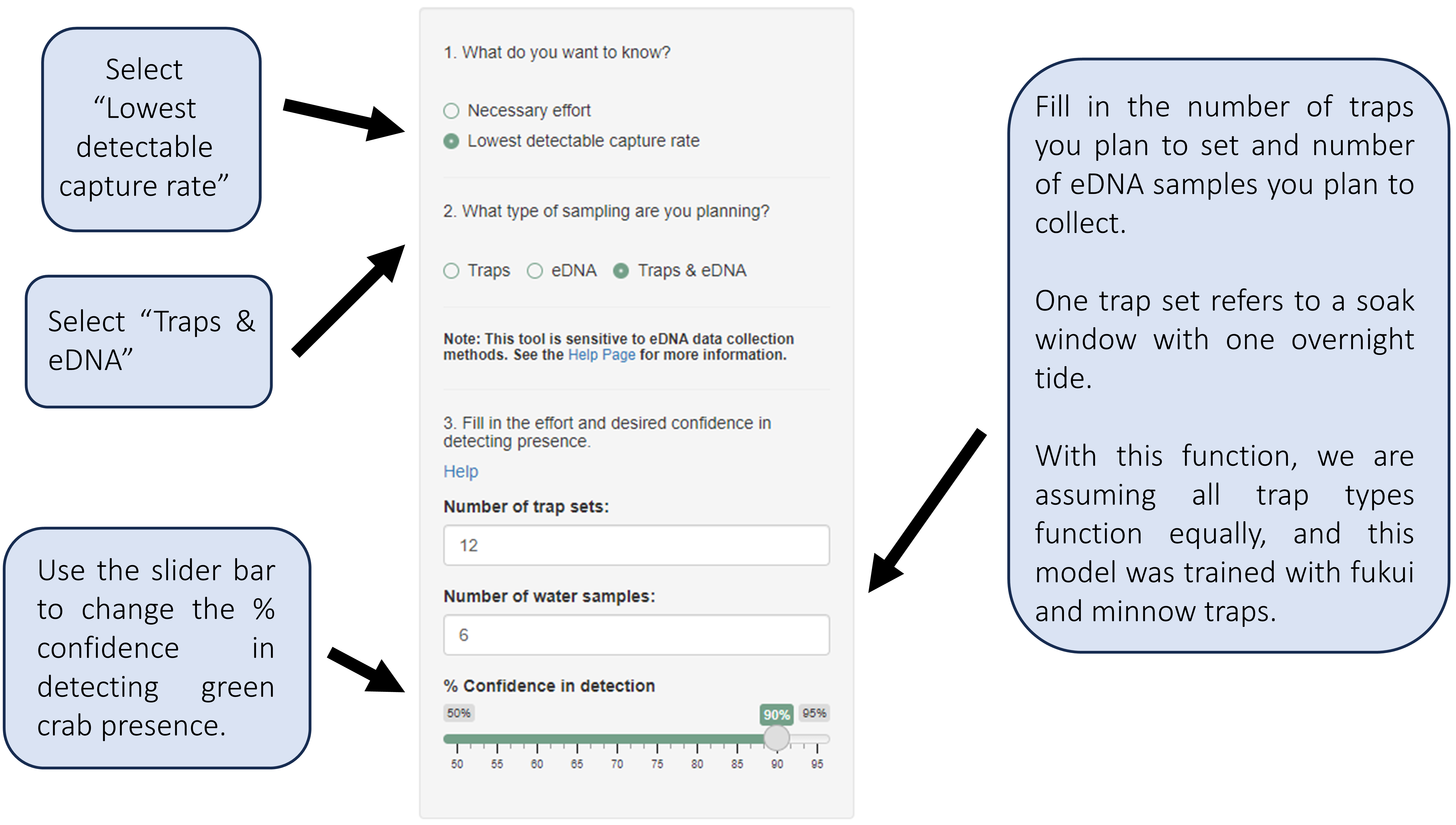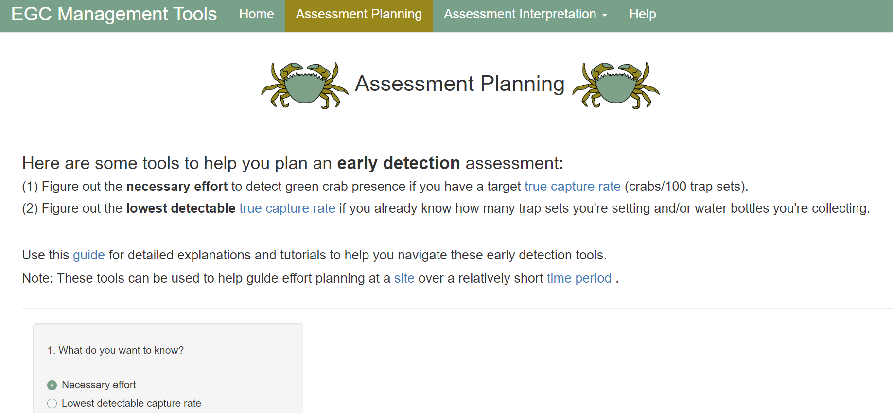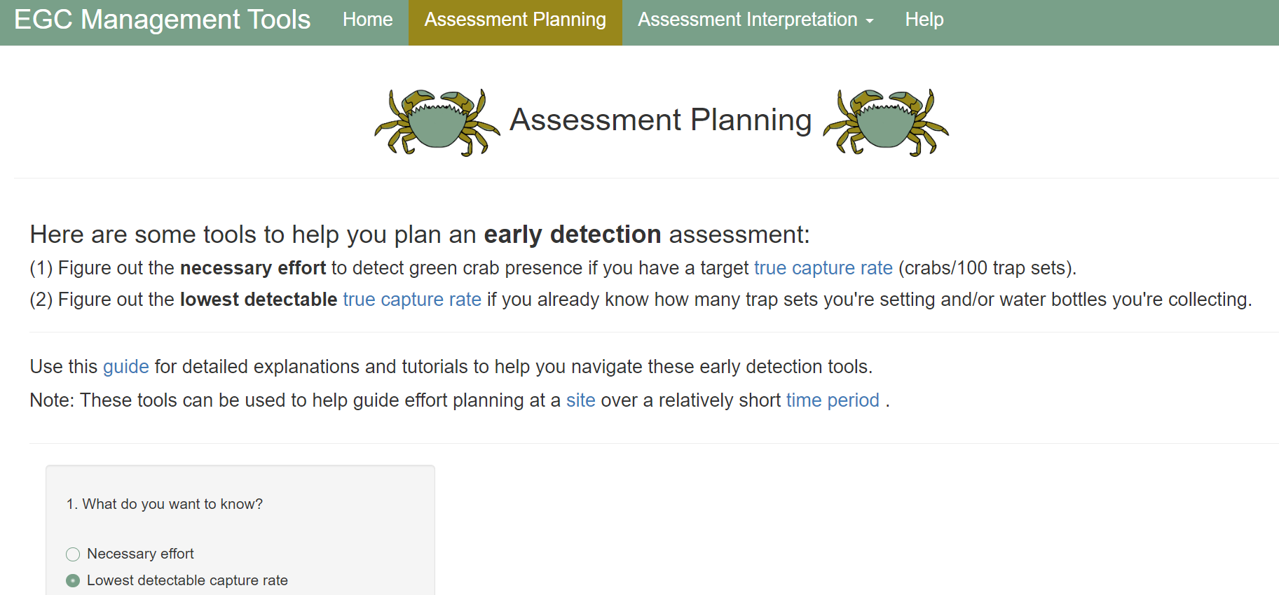 These tools should be used during early detection assessment planning and are all geared toward the goal of detecting green crab presence. “Detecting presence” refers to catching at least one green crab or producing at least one eDNA detection.