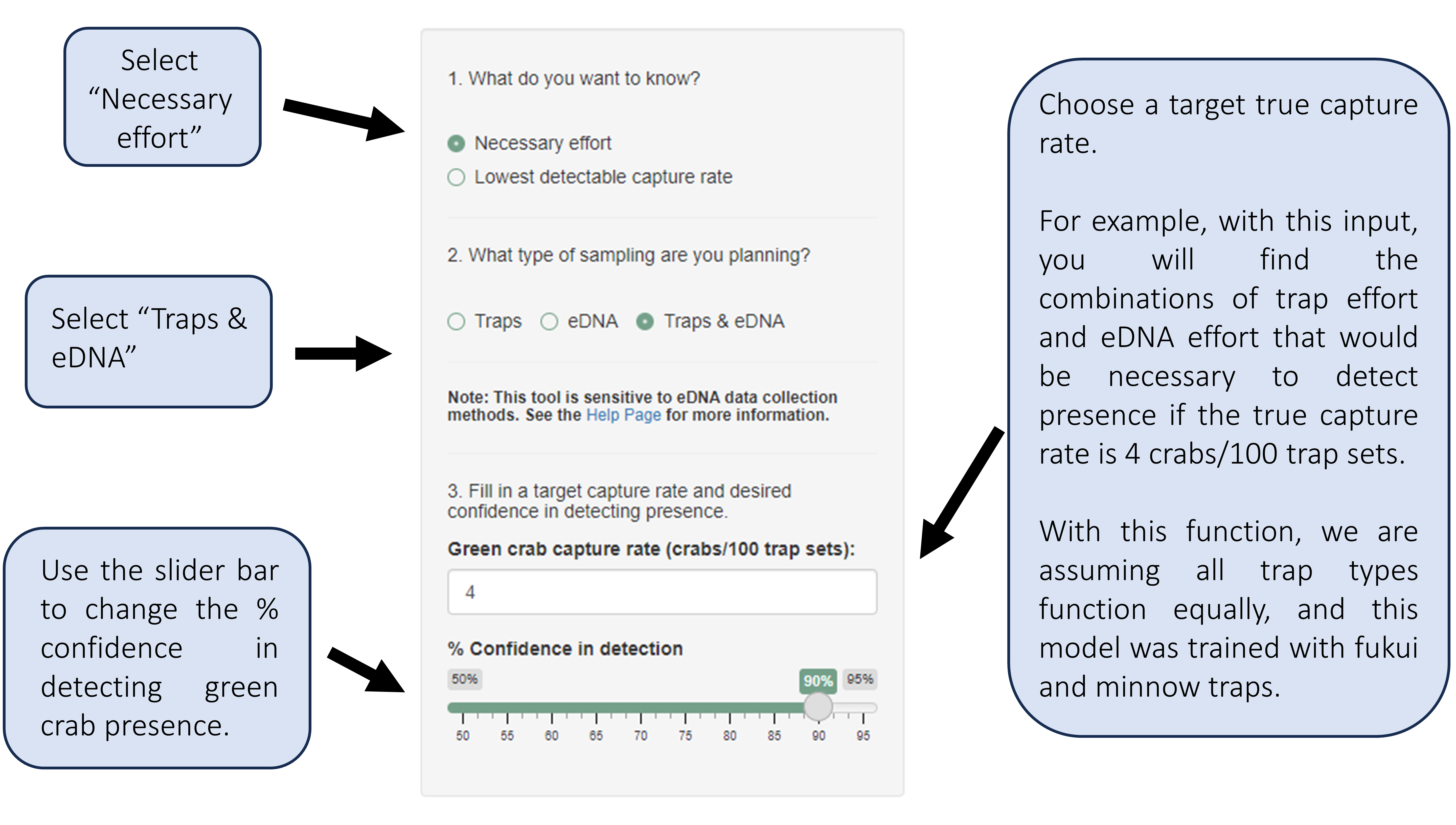 This function helps you identify all combinations of trapping and eDNA efforts that would be necessary to detect green crab presence. In this scenario, “detecting presence” means catching a crab or producing one true positive eDNA detection.