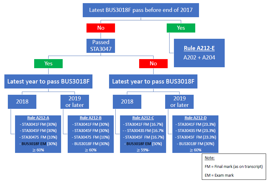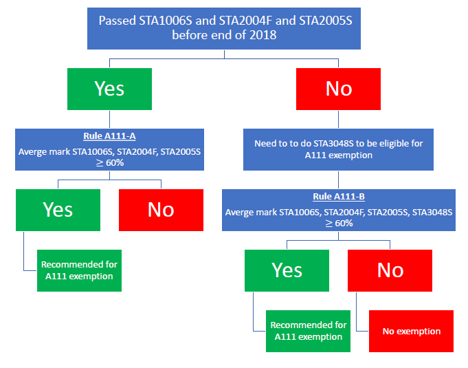 The A111 exemption includes STA3048S, Statistical Modelling and Bayesian Analysis. This was not available until 2019 and so the decision tree below arises.