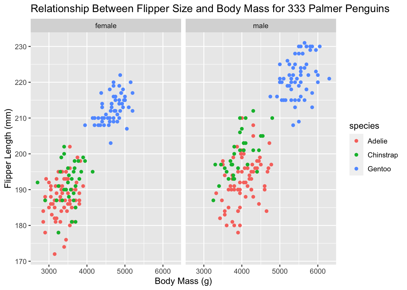 We’ve just seen facet_wrap() There is also facet_grid(). Let’s split up the data by both sex and species.