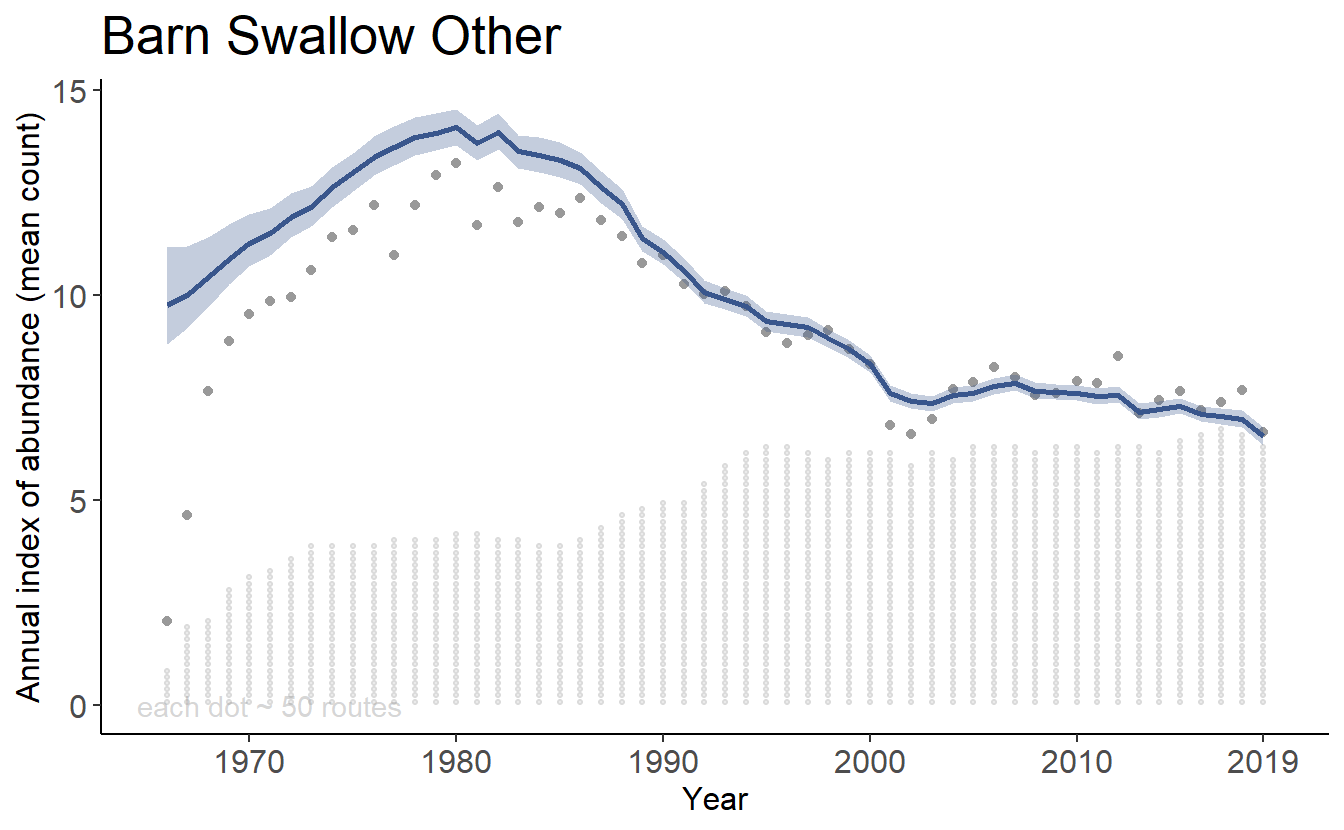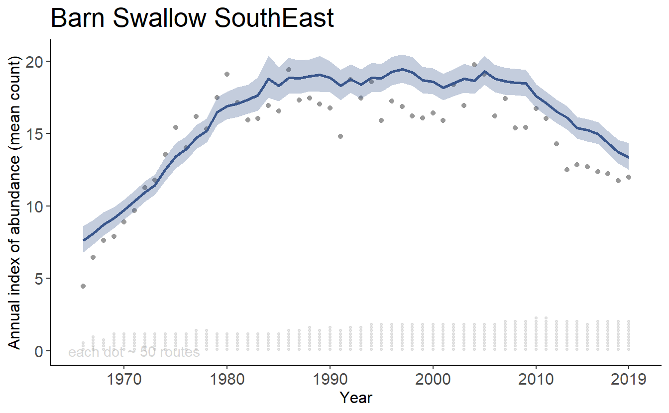 Yes, you can calculate the trend and trajectories for custom combinations of strata, such as a formal trend estimate for populations of Barn Swallow in the South East portion of their range (e.g., BCRs 21,24,25,26,27,35,36, and 37).