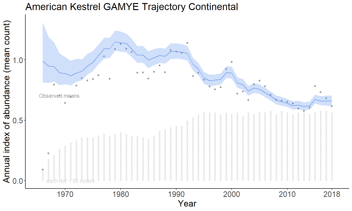 The gamye option includes the semiparametric smooth used in the gam option, but also includes random year-effect terms that track annual fluctuations around the smooth, also in (Smith and Edwards 2020). This is the model that the Canadian Wildlife Service is now using for the annual status and trend estimates.