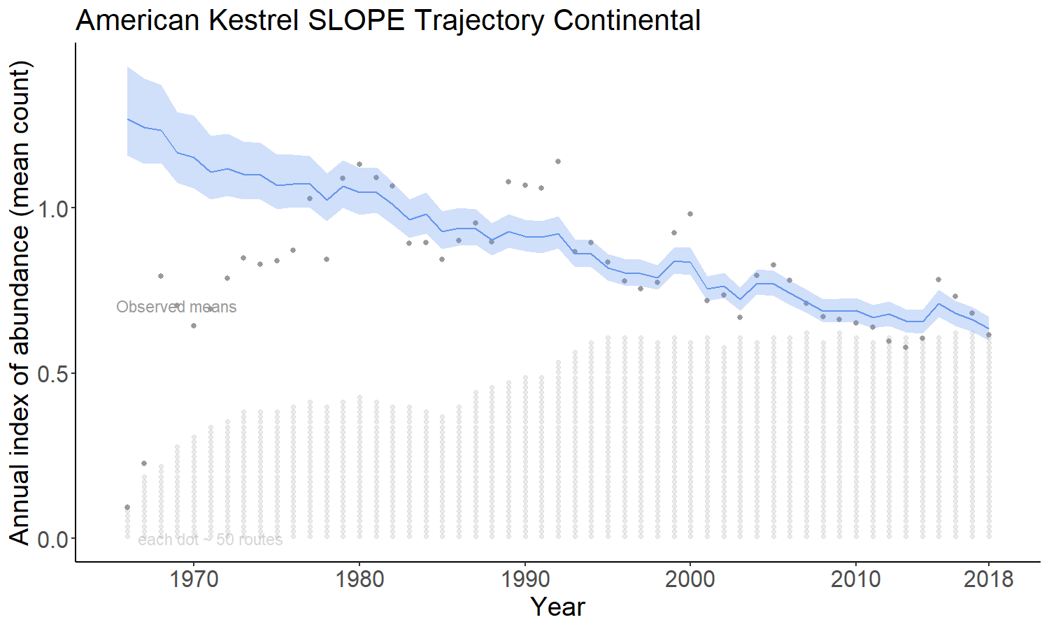 The slope option estimates the time series as a log-linear regression with random year-effect terms that allow the trajectory to depart from the smooth regression line. It is the model used by the USGS and CWS to estimate BBS trends between 2011 and 2018. The basic model was first described in 2002 (Link and Sauer 2002a) and its application to the annual status and trend estimates is documented in (Sauer and Link 2011) and (Smith et al. 2014).