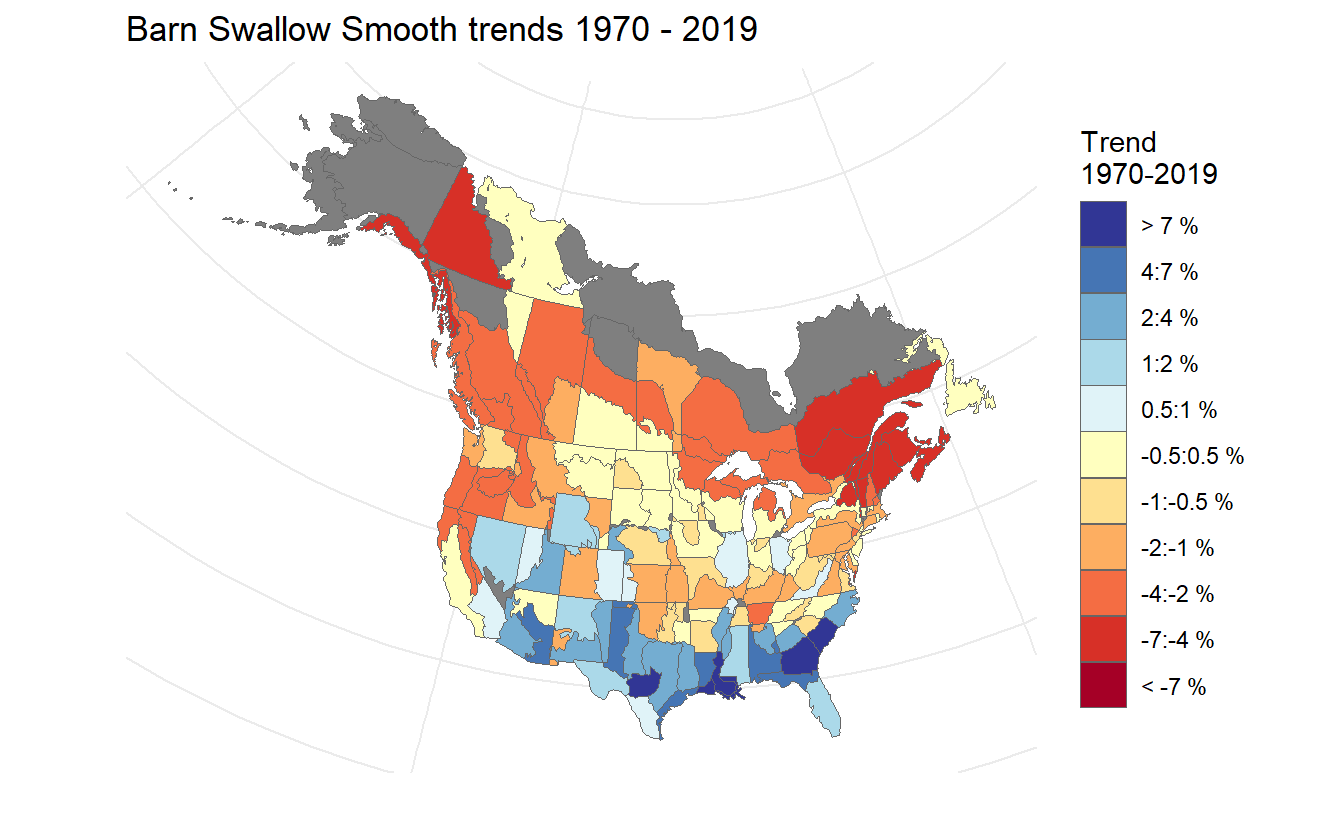 Now that we have calculated values for the trends and trajectories, bbsBayes also includes functions to plot and map the values.