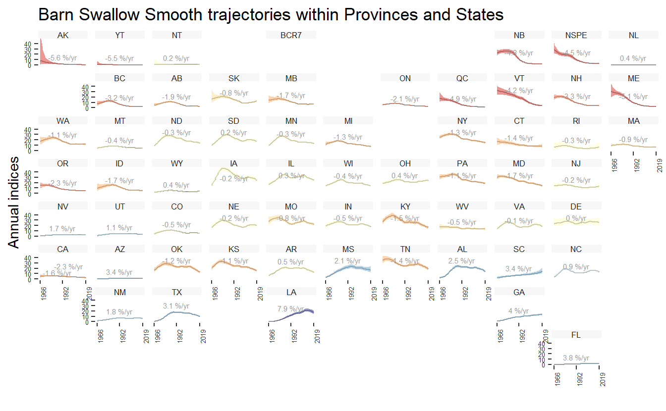 For stratifications that can be compiled by political regions (i.e., bbs_cws, bbs_usgs, or state), the function geofacet_plot will generate a ggplot object that plots the state and province level population trajectories in facets arranged in an approximately geographic arrangement. These plots offer a concise, range-wide summary of a species’ population trajectory.