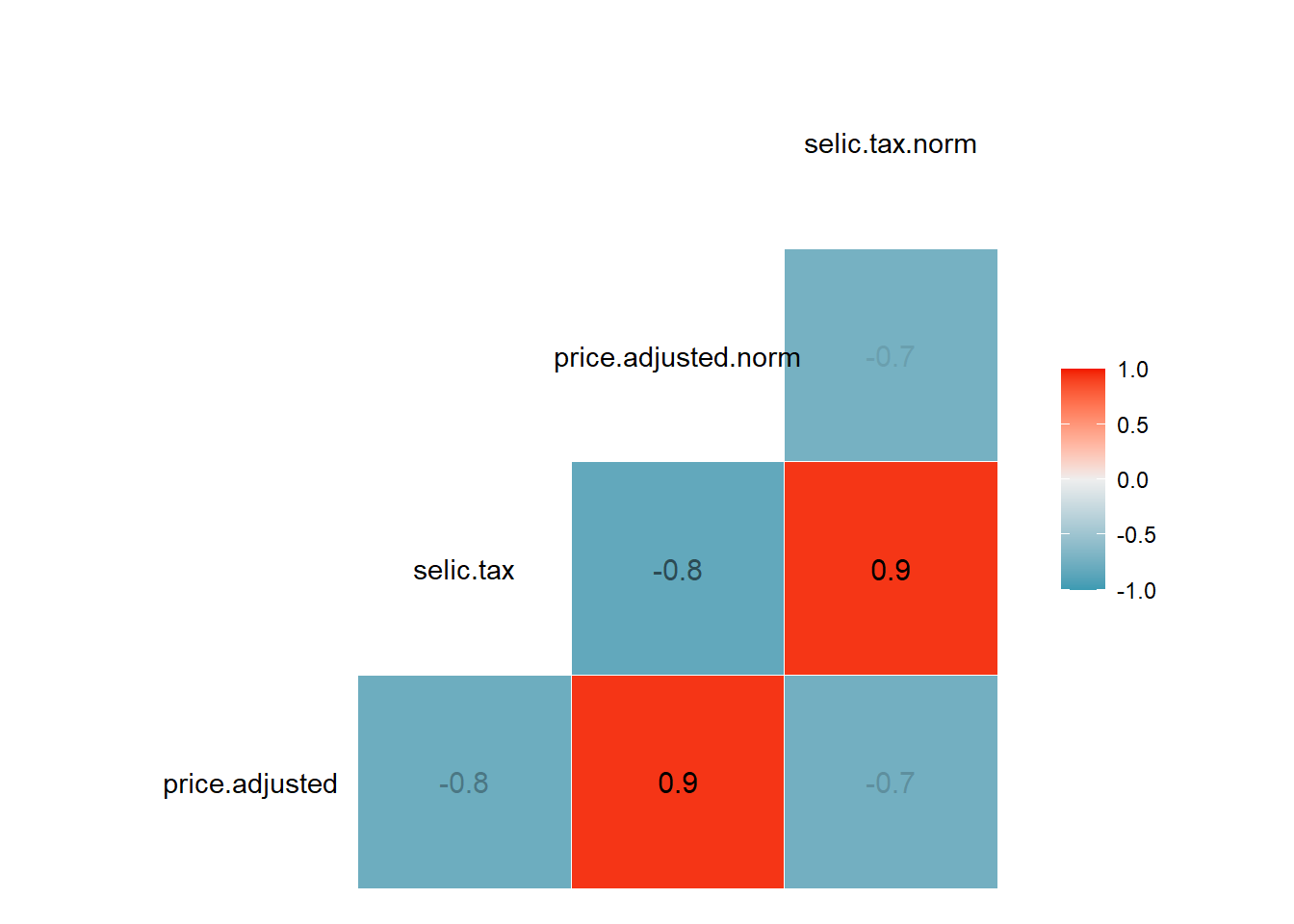 with(cor(price.adjusted, selic.tax, method = c("pearson")))