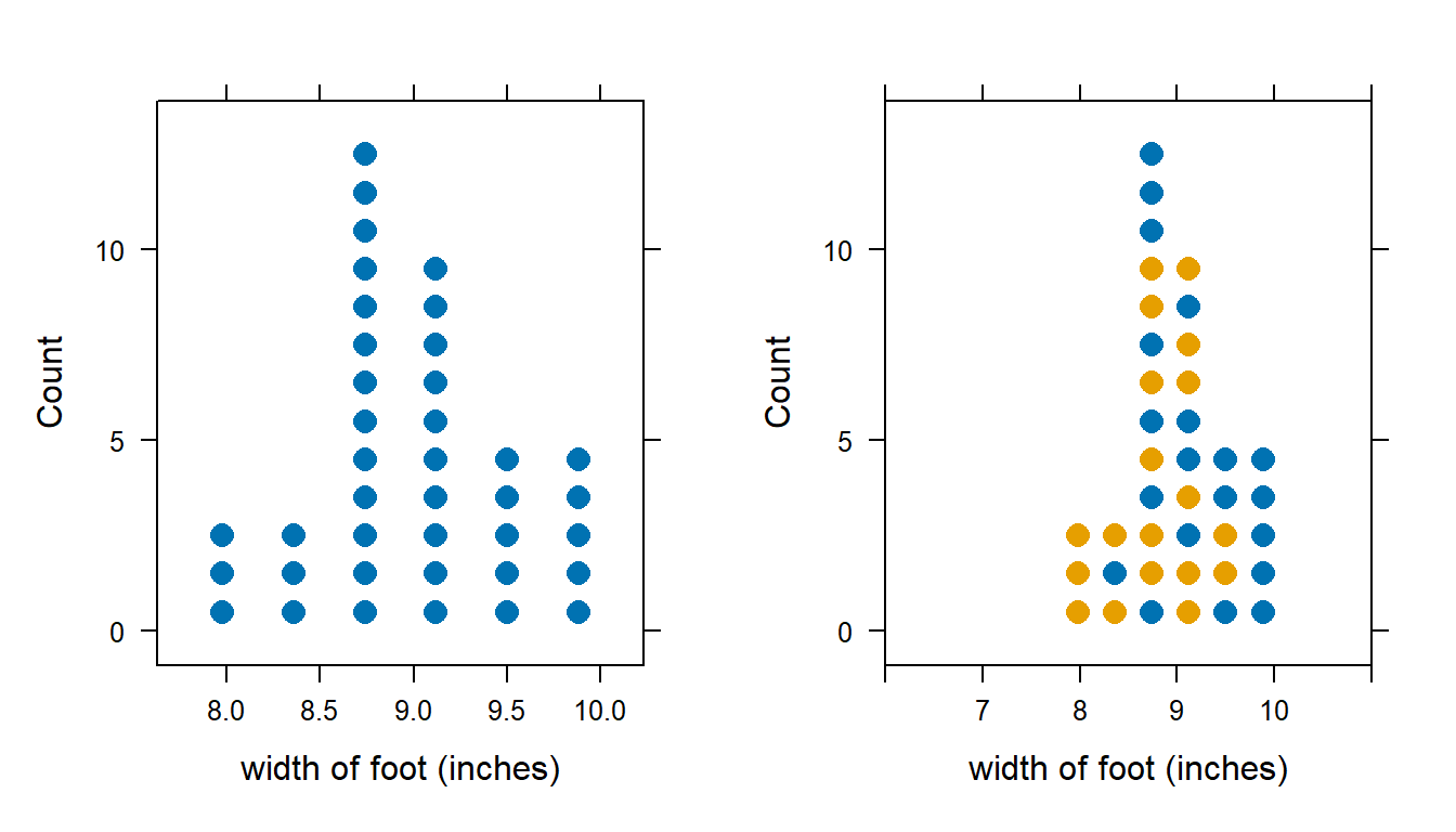 gf_dotplot(~width, fill = ~sex, data=KidsFeet, binwidth = 0.1,