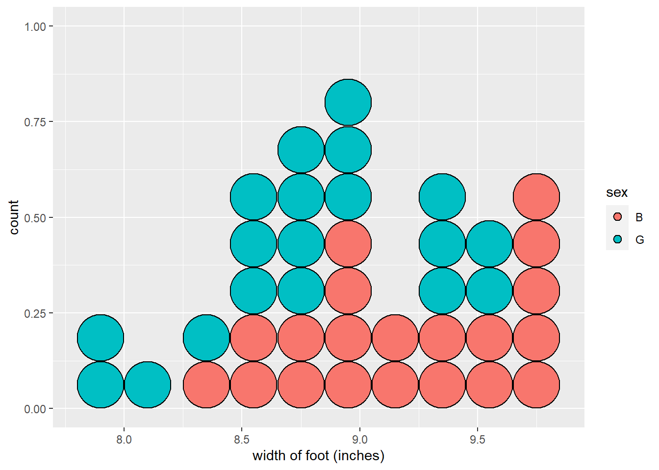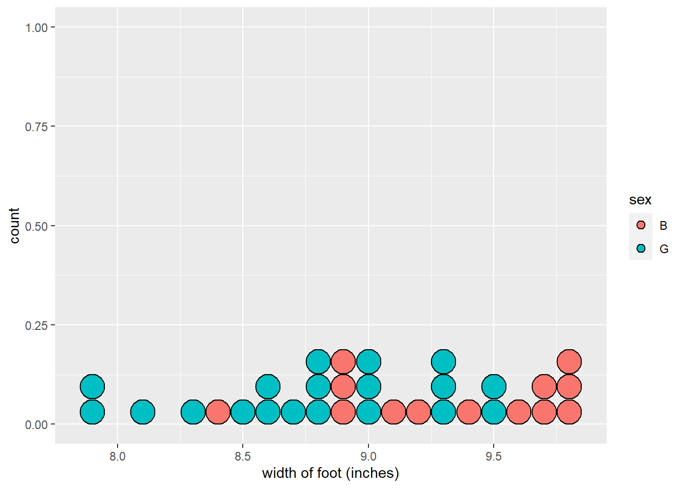 gf_dotplot(~width, fill = ~sex, data=KidsFeet, binwidth = 0.2,