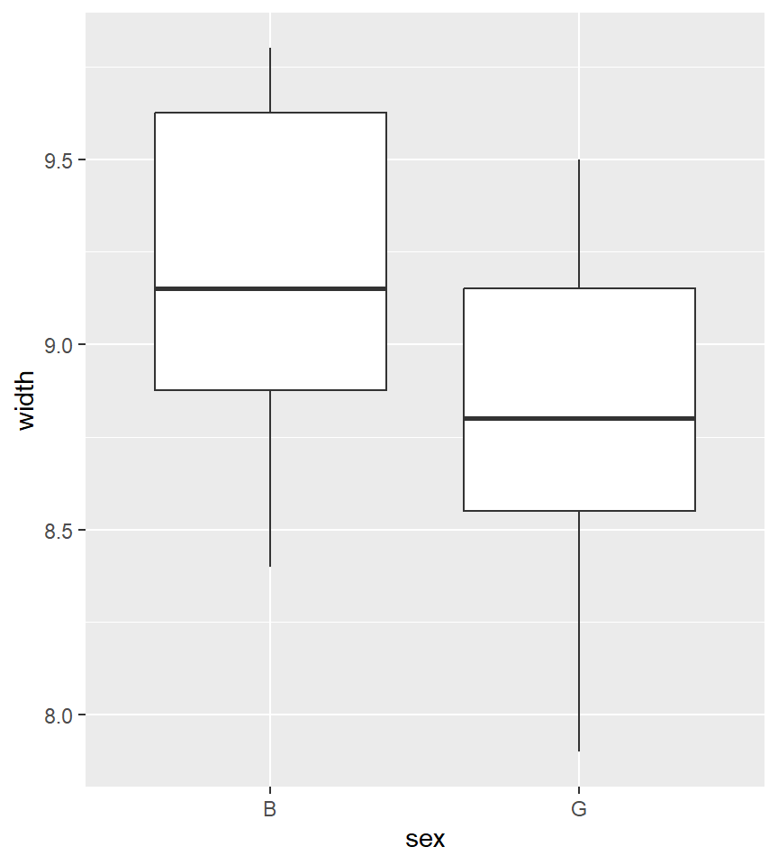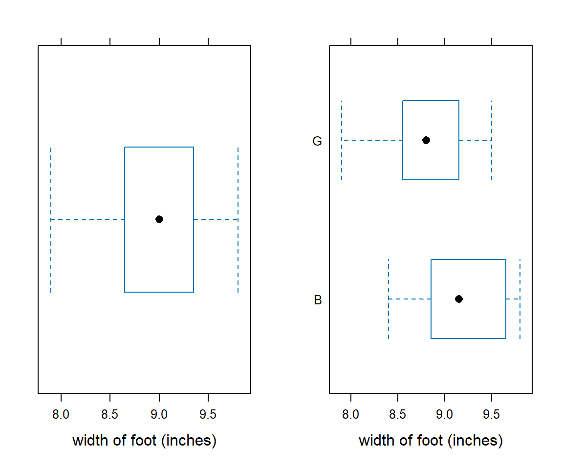 bwplot(width~sex , data=KidsFeet, xlab = "width of foot (inches)")