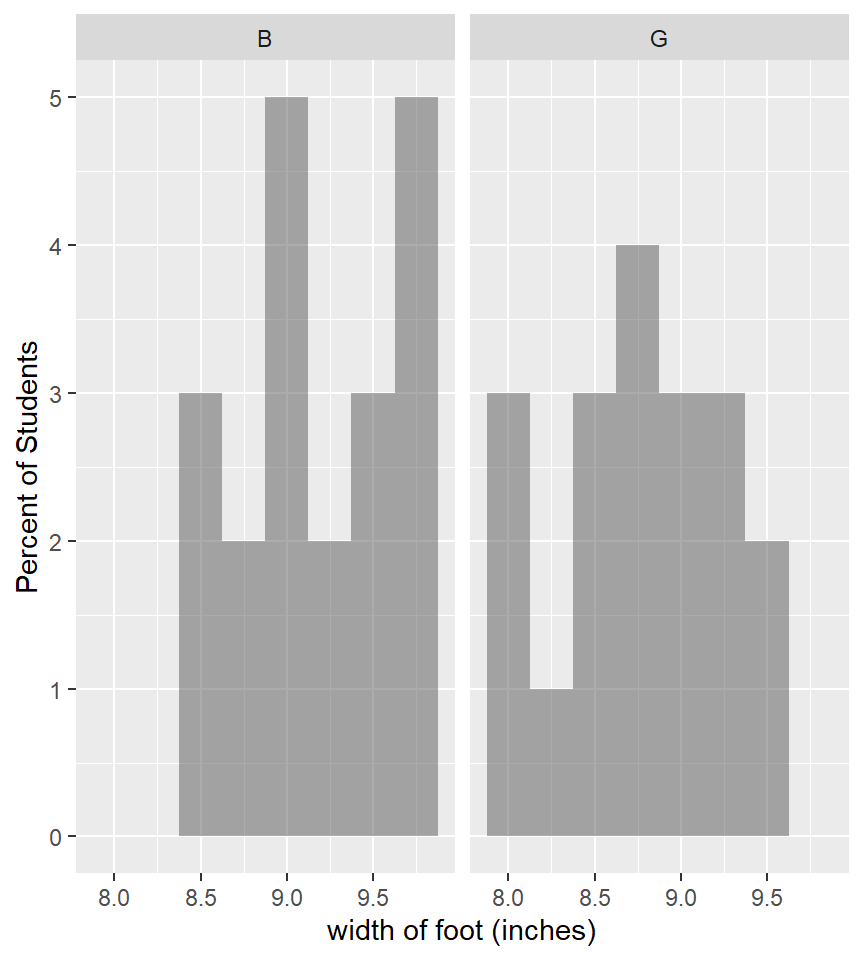 histogram(~width | sex, data=KidsFeet, xlab = "width of foot (inches)",