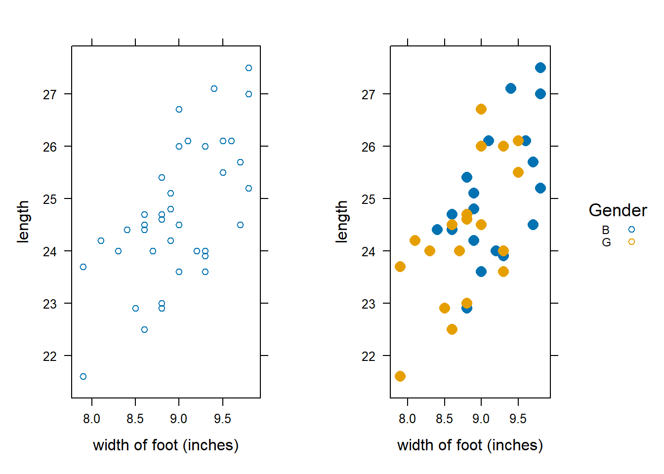 xyplot(length~width, data=KidsFeet, xlab = "width of foot (inches)")