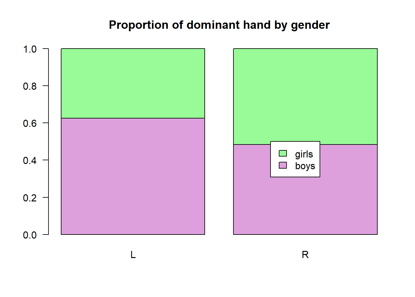 gf_props(~sex, fill = ~ domhand, data=KidsFeet,