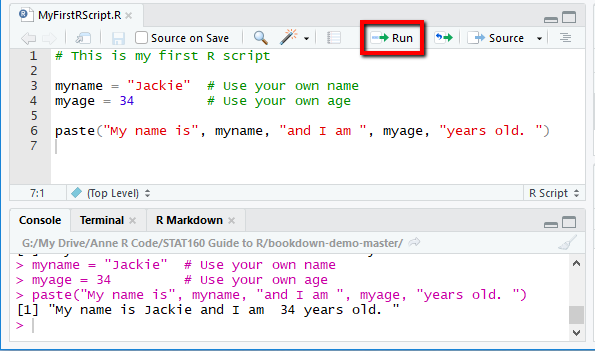 You may now run each line of your script by clicking on the RUN button, or press the CTRL+ENTER keys simultaneously.