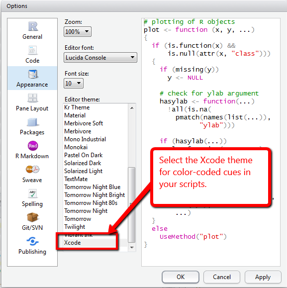 in the Source panel. R code can be entered here, and buttons