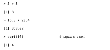 Notice that RStudio divides its world into four panels. Several of the panels are further subdivided into multiple tabs. Which tabs appear in which panels can be customized by the user. R can do much more than a simple calculator, and we will introduce additional features in due time. But performing simple calculations in R is a good way to begin learning the features of RStudio. Commands entered in the Console tab are immediately executed by R. A good way to familiarize yourself with the console is to do some simple calculator-like computations. Most of this will work just like you would expect from a typical calculator. Try typing the following command in the console panel.