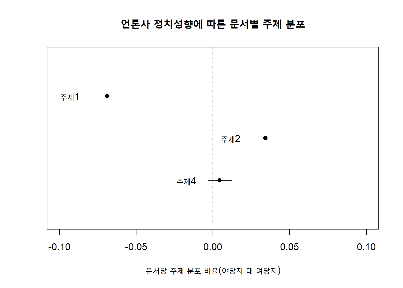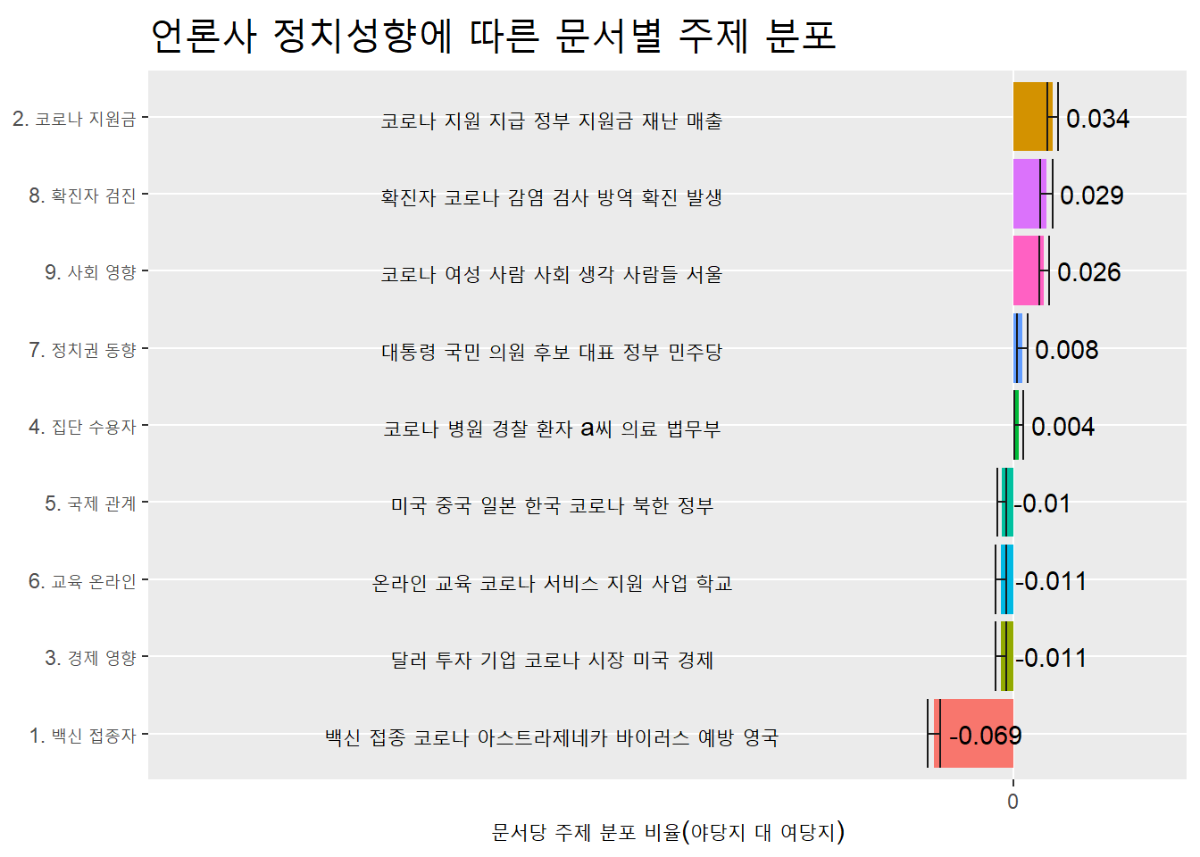 labs(x = "문서당 주제 분포 비율(야당지 대 여당지)",