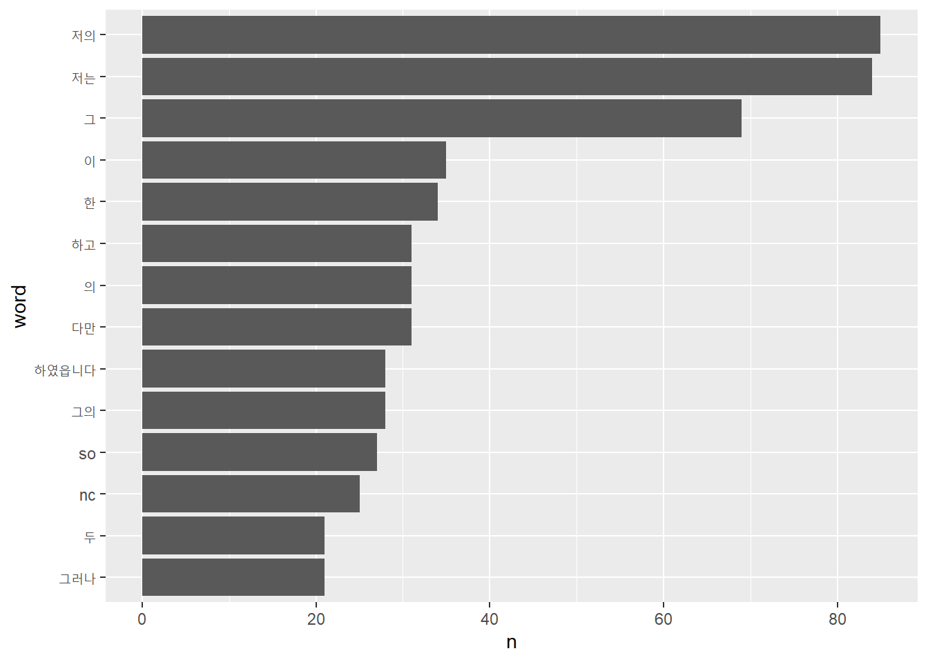 “저의 저는 그 이” 등의 단어가 많이 사용됐다. 분석 전에 정제를 충분하기 않아 의미를 파악하기 어렵다. 데이터 정제방법은 추후 자세하게 다룬다.