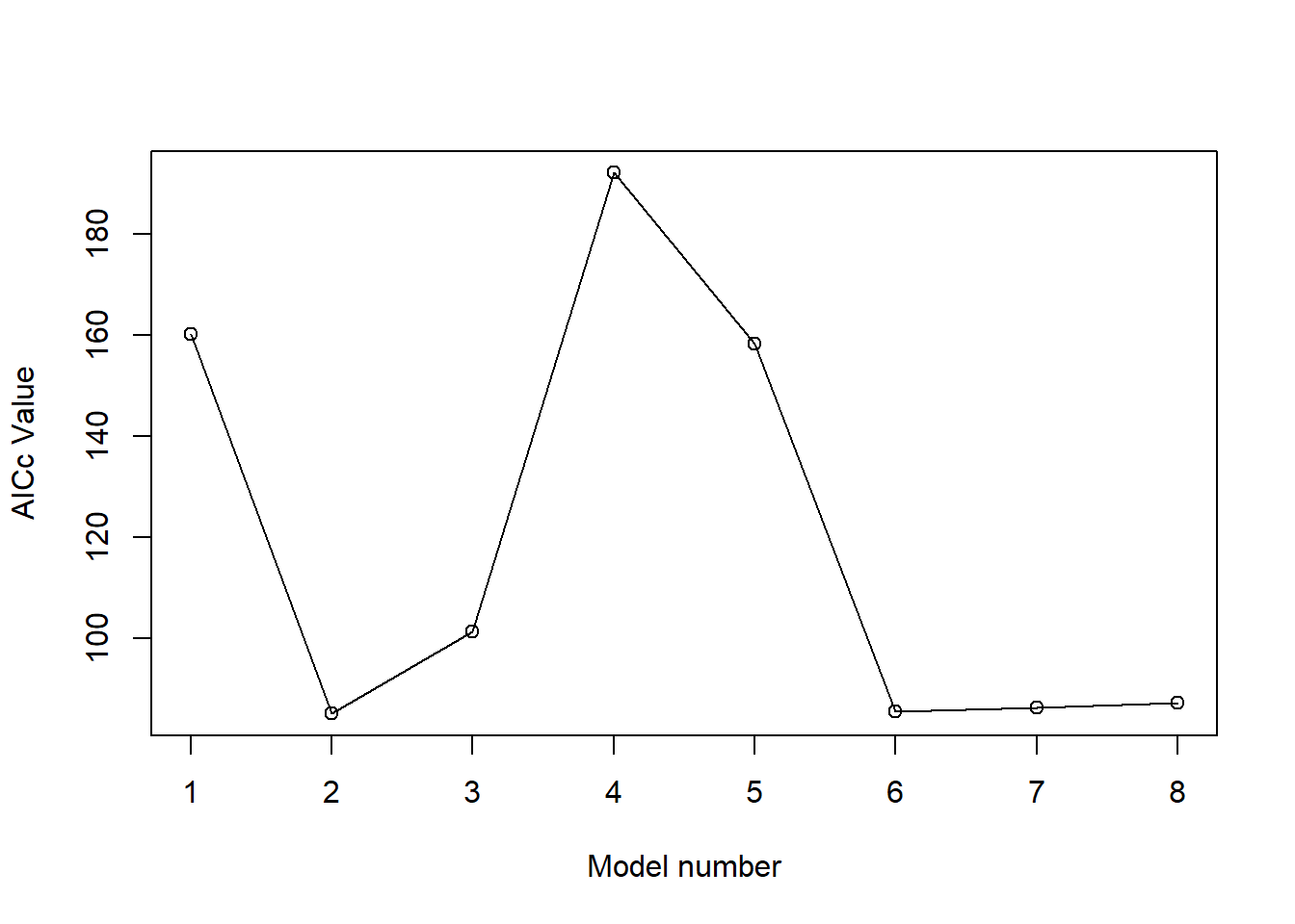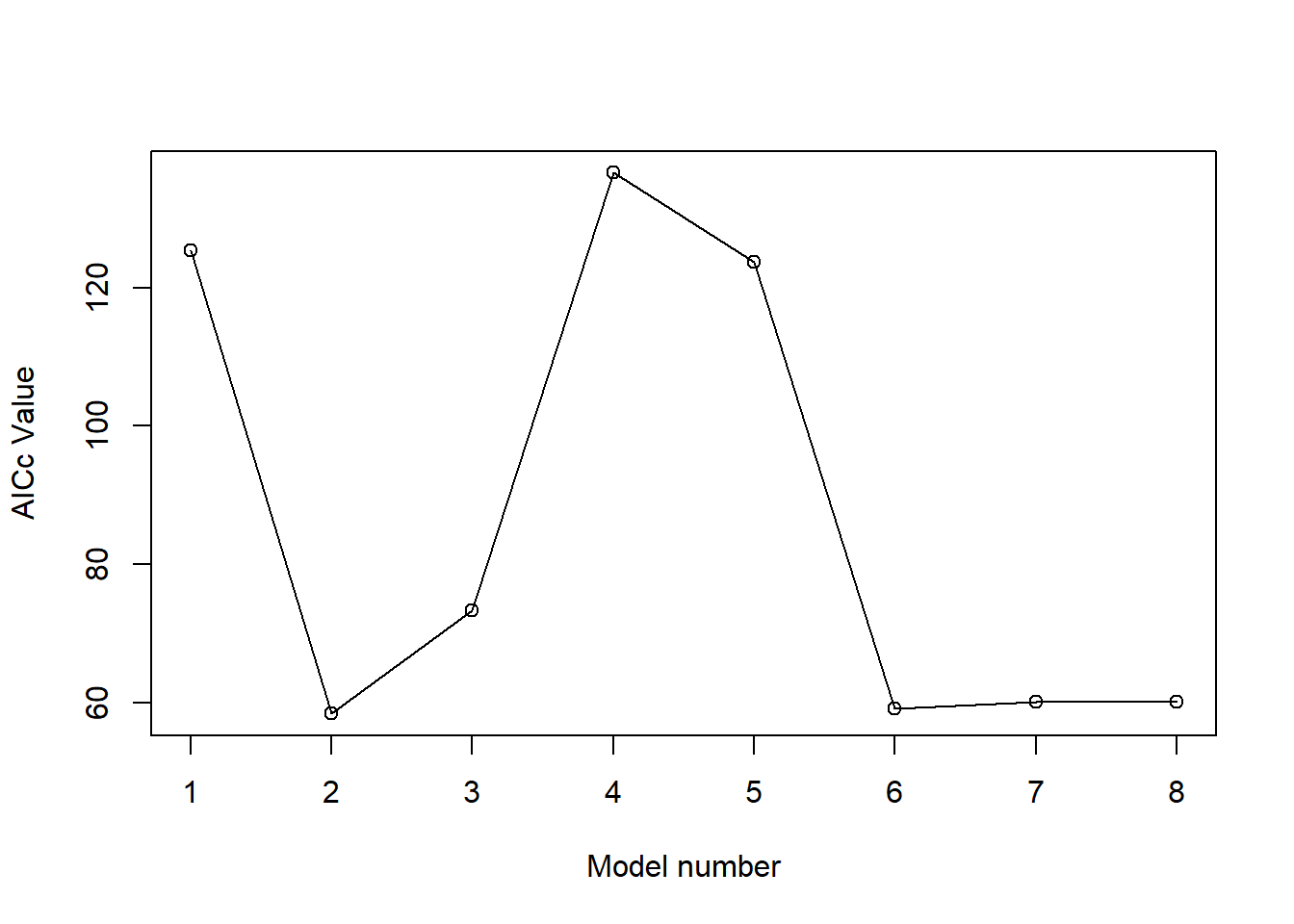 ## [1] 0.3086193可以看出m6模型的 AICc值最小, 表示这个回归模型预测准确率最高。所以m6应该是最佳线性回归模型。