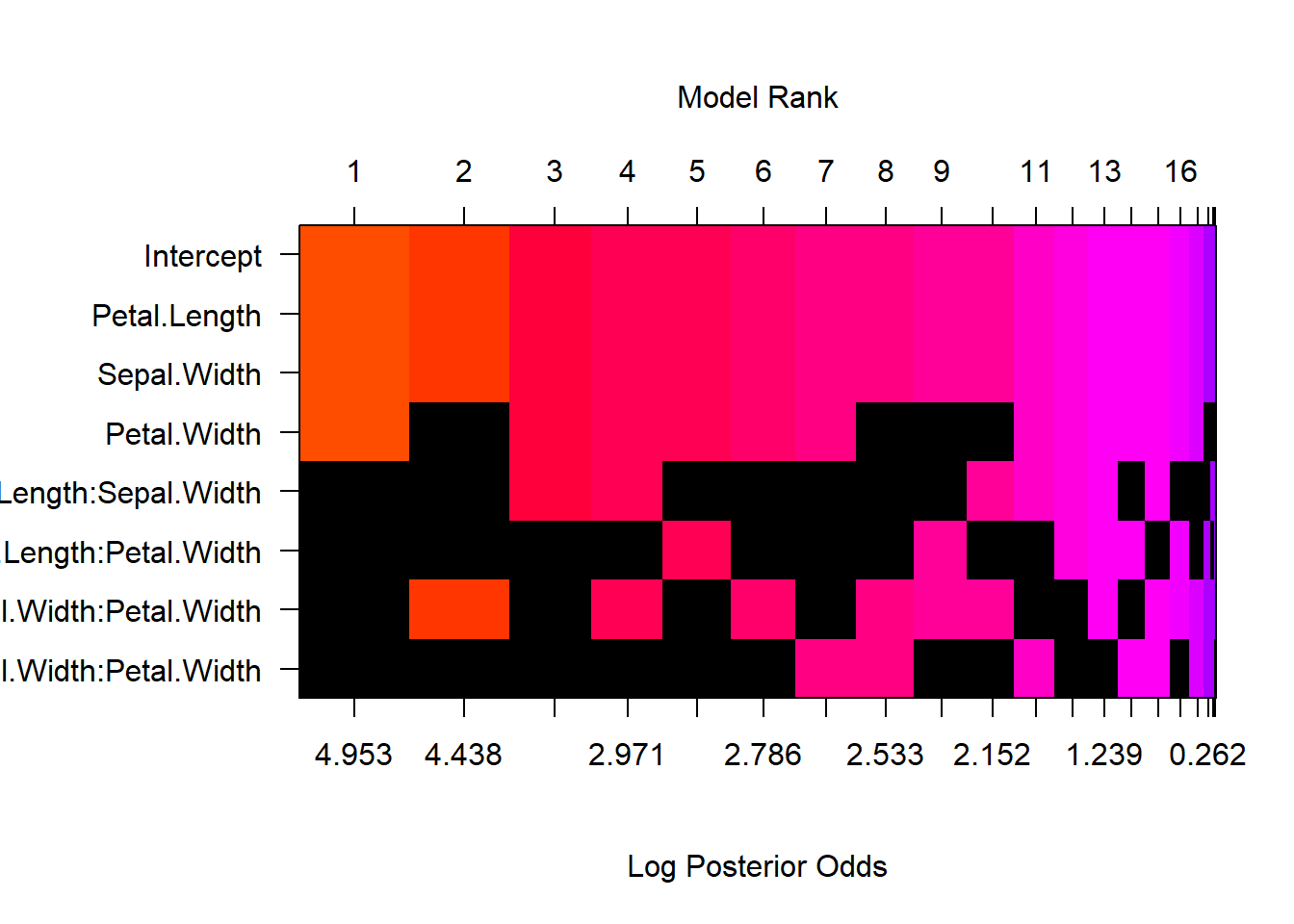 在这里,我们看到了按后验优势比排序的模型,其中黑色正方形表示每个模型遗漏了哪些特征。 就像我们先前的stepAIC线性模型特征缩减一样,“检查”可以被认为是对 Sepal.Length 进行预测的不良特征。