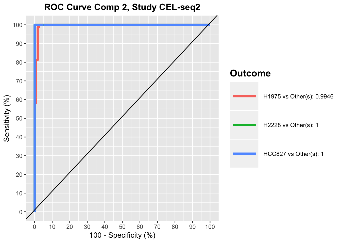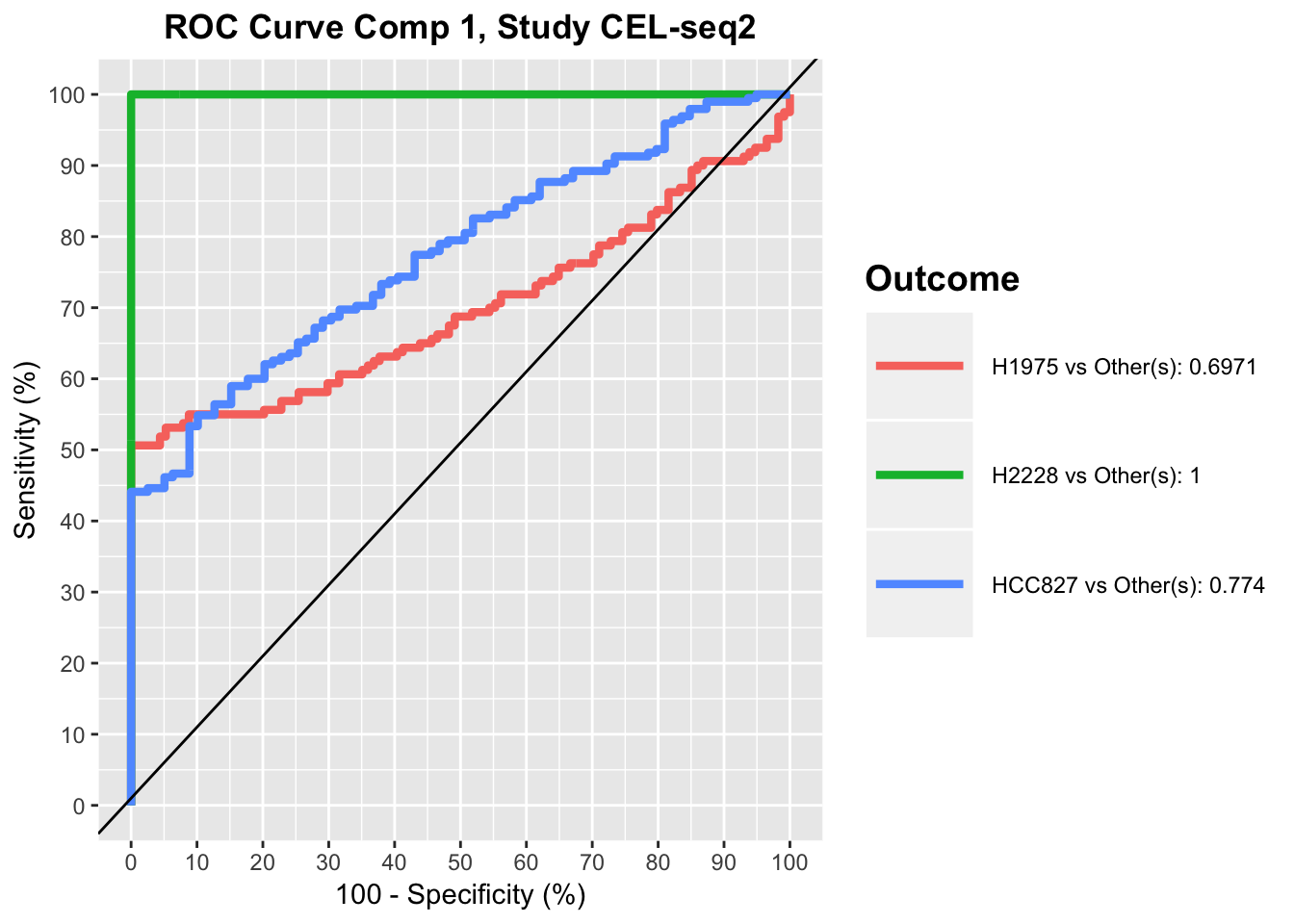ROC plots show that for CEL-seq data, the model has relatively low prediction accuracy for HCC827 and H1975 samples in the first component, while it has high prediction accuracy for all samples in the second component. This was also apparent in sPLS-DA plot, as HCC827 and H1975 samples were not separated along the first PLSDA component for CEL-seq data, while most of samples were differentiated along the second component by their cell lines.