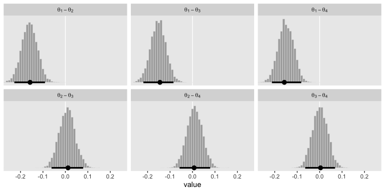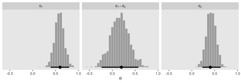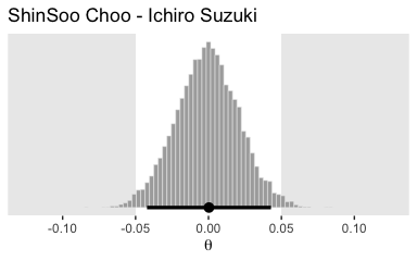 In this case, the entire posterior distribution (i.e., all the iterations of the chains) was below zero and we ended up with an Evid.Ratio = Inf. Our Bayes factor blew up. If we’d like to test a point null hypothesis, we might reformat the equation to \(\theta_\text{Das Kruschke} = \theta_\text{Bach}\).