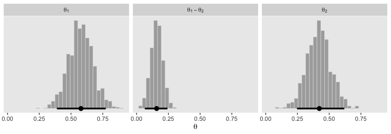 alpha = 0.05(5%) an, the credible interval will contain1 -alpha = 0.95(95%) of the posterior values. Hence,alpha*100% of the posterior values will lie outside of the credible interval. Although this allows testing of hypotheses in a similar manner as in the frequentist null-hypothesis testing framework, we strongly argue against using arbitrary cutoffs (e.g.,p < .05) to determine the ‘existence’ of an effect.