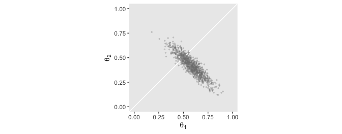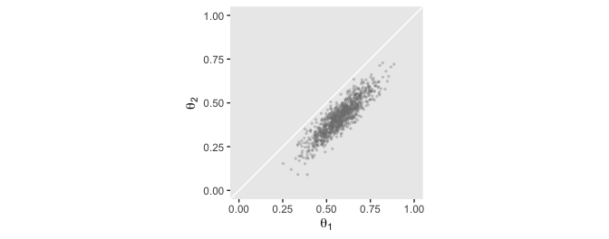 Following the a < b format, let’s say we wanted to test the hypothesis \(\theta_\text{Das Kruschke} < \theta_\text{Bach}\), based on fit2. If we convert the relevant parameters from the log-odds metric to the probability scale with inv_logit_scaled(), we can specify that hypothesis as a string and place it into the hypothesis() function.