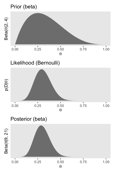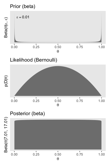 mutate(posterior = (likelihood * prior) / sum(likelihood * prior)) %>% # (i.e., p(theta | D))