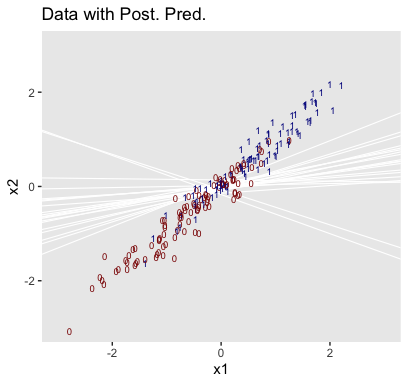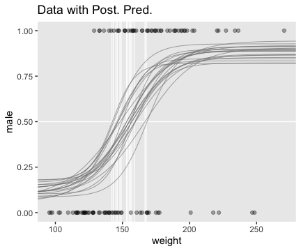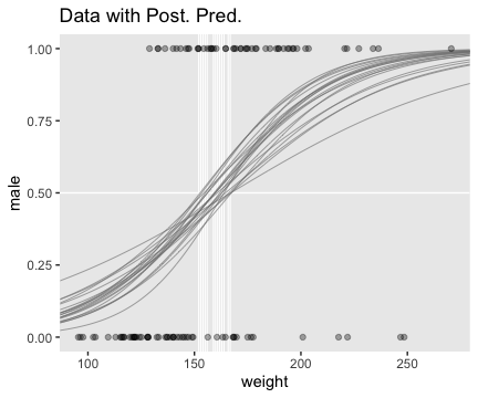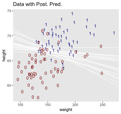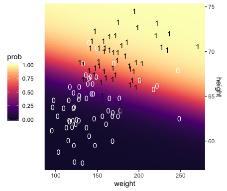 Looks like the data for which male == 1 are concentrated in the upper right and those for which male == 0 are more so in the lower left. What we’d like is a model that would tell us the optimal dividing line(s) between our male categories with respect to those predictor variables.
