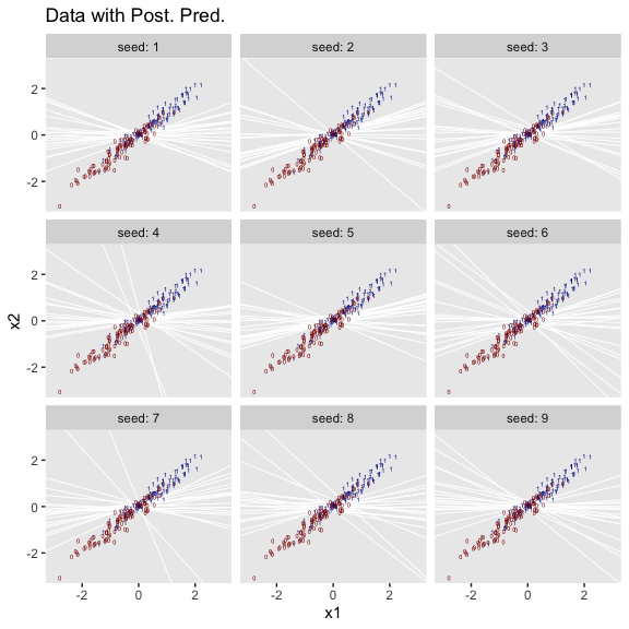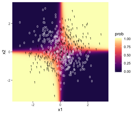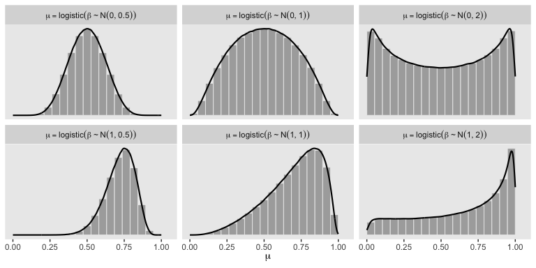 \[\begin{align*} \mu & = \operatorname{logistic} (\beta_0 + \beta_1 x_1 + \beta_2 x_2) \\ y & \sim \operatorname{Bernoulli} (\mu) \end{align*}\]