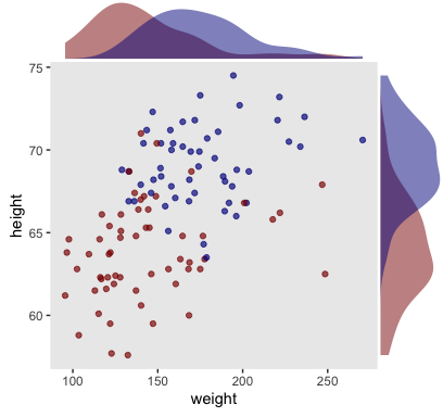 weight_z = (weight - mean(weight)) / sd(weight))Before we fit a model, we might take a quick look at the data. The ggMarginal() function from the ggExtra package will be of help, here.