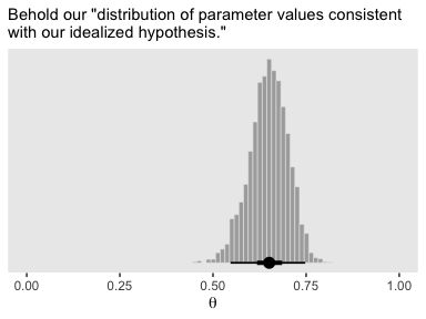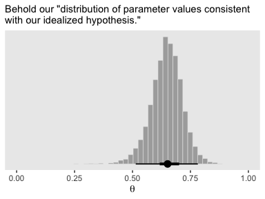 The best that a large sample can do is exactly reflect the data-generating distribution. If the data-generating distribution has considerable mass straddling the null value, then the best we can do is get estimates that include and straddle the null value. As a simple example, suppose that we think that a coin may be biased, and the data-generating hypothesis entertains four possible values of \(\theta\) , with \(p (\theta = 0.5) = 25 \%\), \(p (\theta = 0.6) = 25 \%\), \(p (\theta = 0.7) = 25 \%\), and \(p (\theta = 0.8) = 25 \%\). Because \(25 \%\) of the simulated data come from a fair coin, the maximum probability of excluding \(\theta = 0.5\), even with a huge sample, is \(75 \%\).