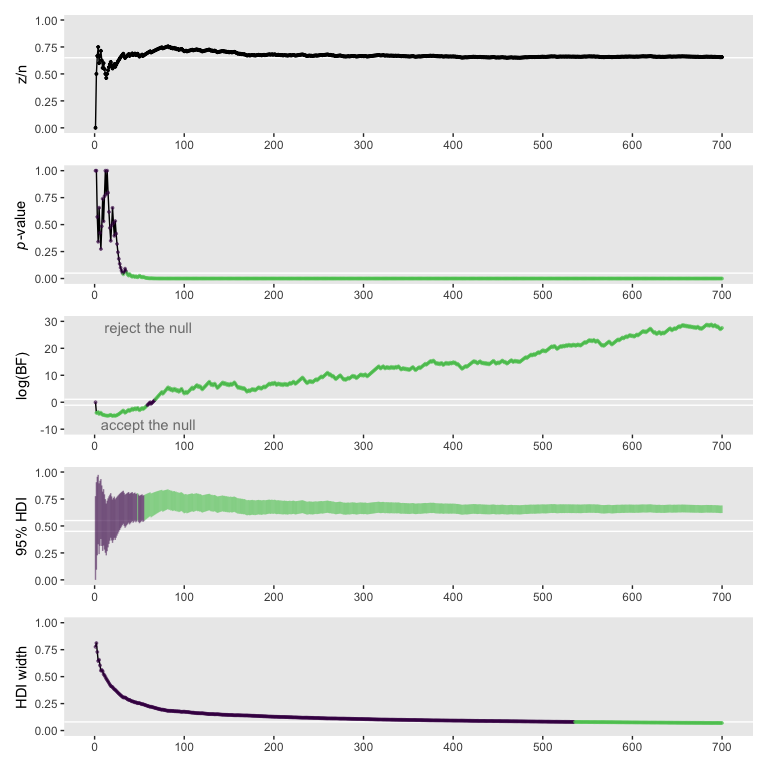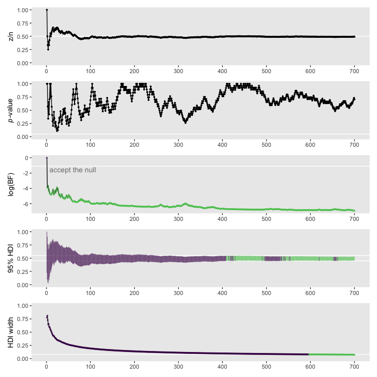 Therefore, when planning the sample size for an experiment, it is crucial to decide what a realistic goal is. If there are good reasons to posit a highly certain data-generating hypothesis, perhaps because of extensive previous results, then a viable goal may be to exclude a null value. On the other hand, if the data-generating hypothesis is somewhat vague, then a more reasonable goal is to attain a desired degree of precision in the posterior. (p. 364, emphasis in the original)