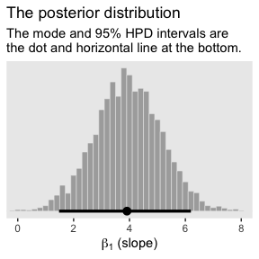 subtitle = "The mode and 95% HPD intervals are\nthe dot and horizontal line at the bottom.",