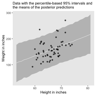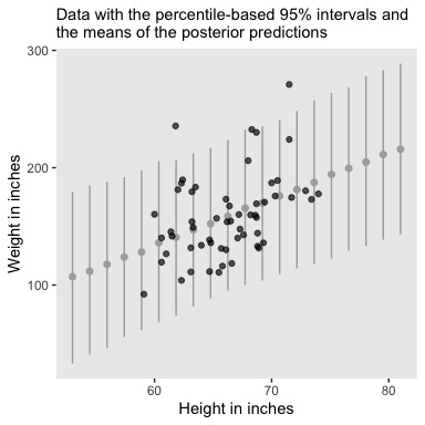 labs(subtitle = "Data with the percentile-based 95% intervals and\nthe means of the posterior predictions",