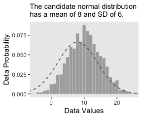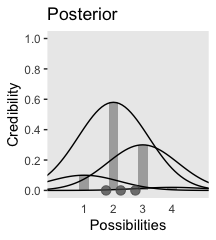 Now on to Figure 2.3. I’m pretty sure the curves in the plot are Gaussian, which we’ll make with the dnorm() function. After a little trial and error, their standard deviations look to be 1.2. However, it’s tricky placing those curves in along with the probabilities, because the probabilities for the four discrete sizes (i.e., 1 through 4) are in a different metric than the Gaussian density curves. Since the probability metric for the four discrete sizes are the primary metric of the plot, we need to rescale the curves using a little algebra. We do that in the data code, below. After that, the code for the plot is relatively simple.